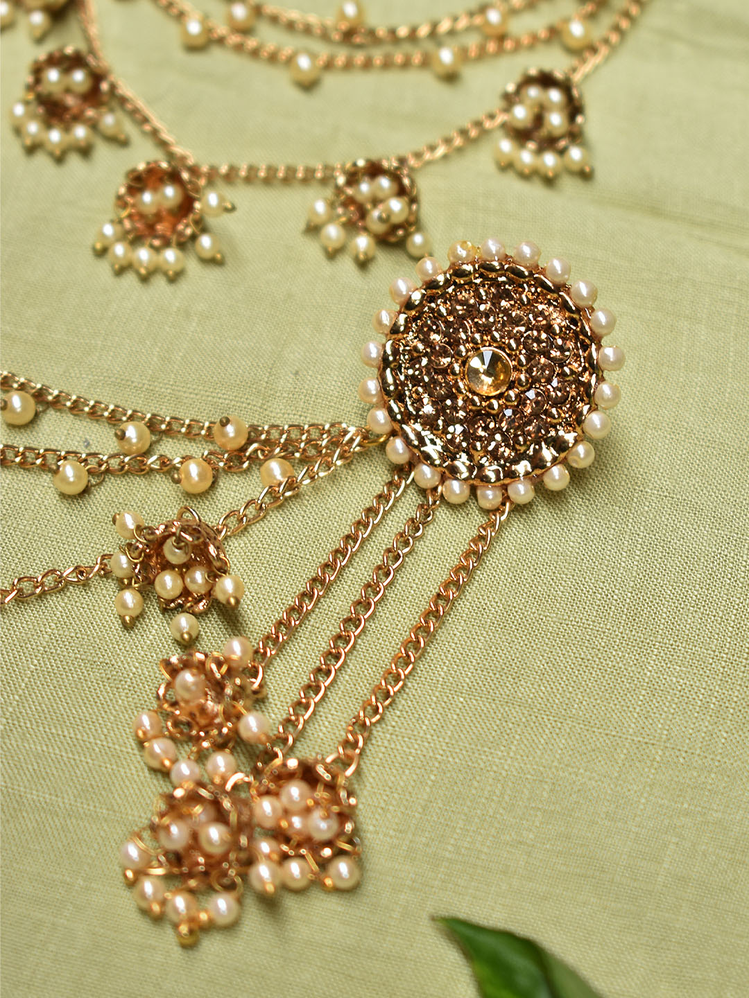 High Quality Gold Plated Circular Design Studs With Three Layered Hanging Pearl Jhumka Chains Bahubali Inspired Dangler Earring