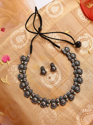 Antique Silver Red Green Meenakari Art Engraved Work Handmade Terracotta Necklace Set