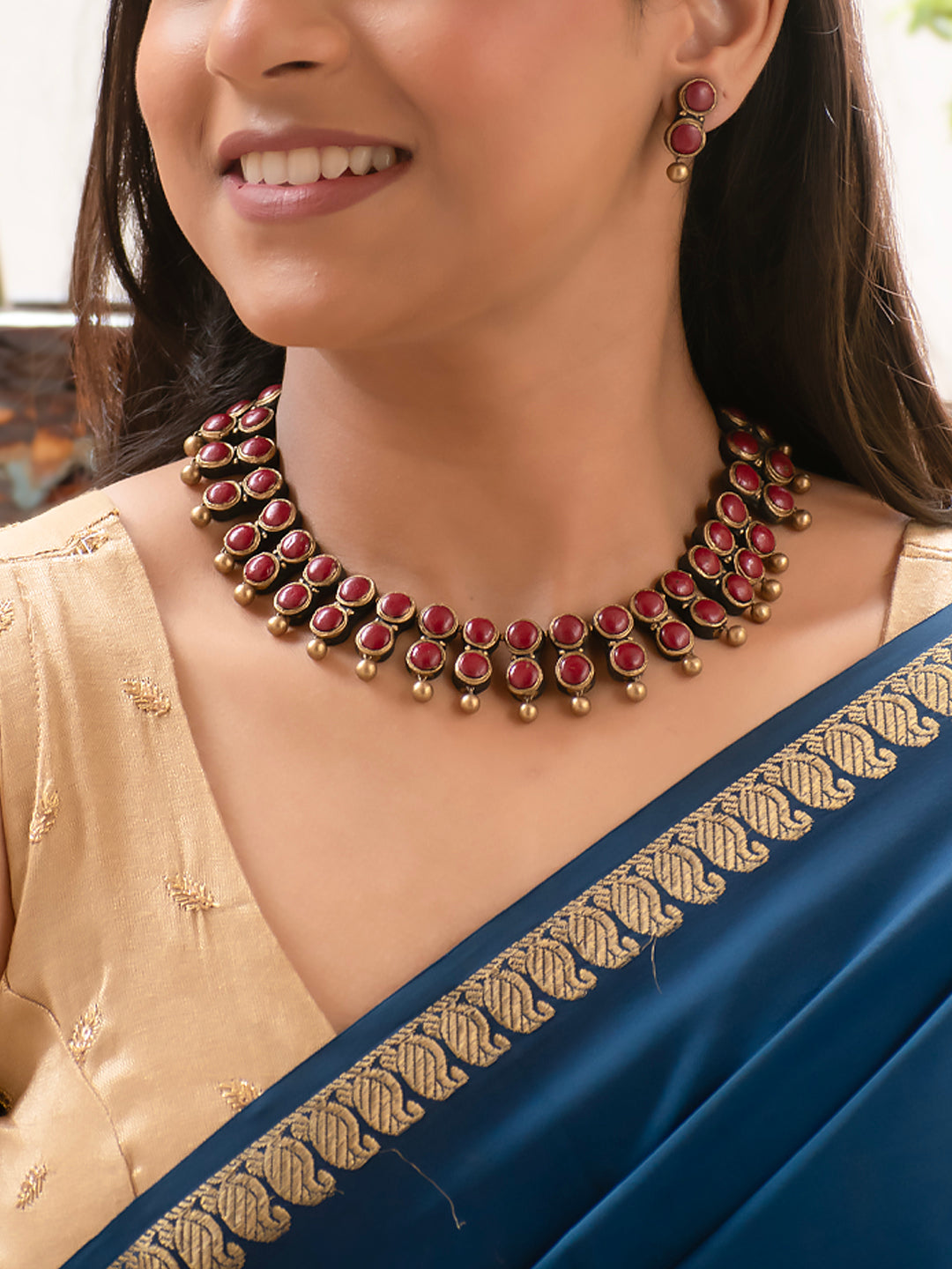 Antique Gold and Maroon Dual Circular Pattern Contemporary Handmade Terracotta Necklace Set