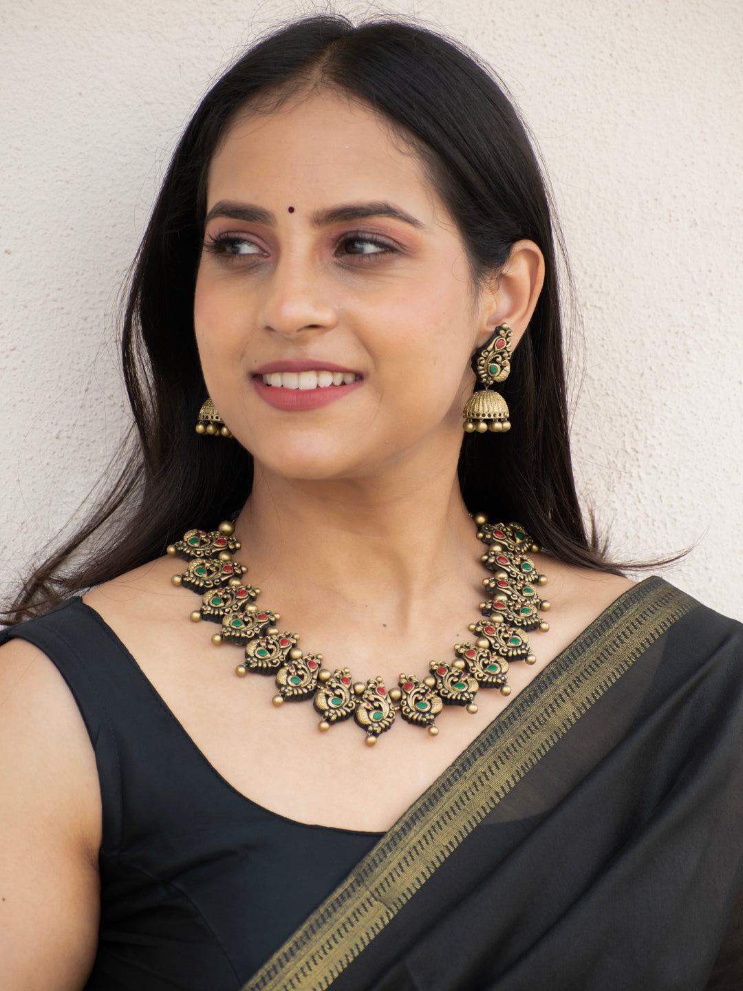Antique Gold Green Red Dancing Peacock Handmade Terracotta Necklace Set