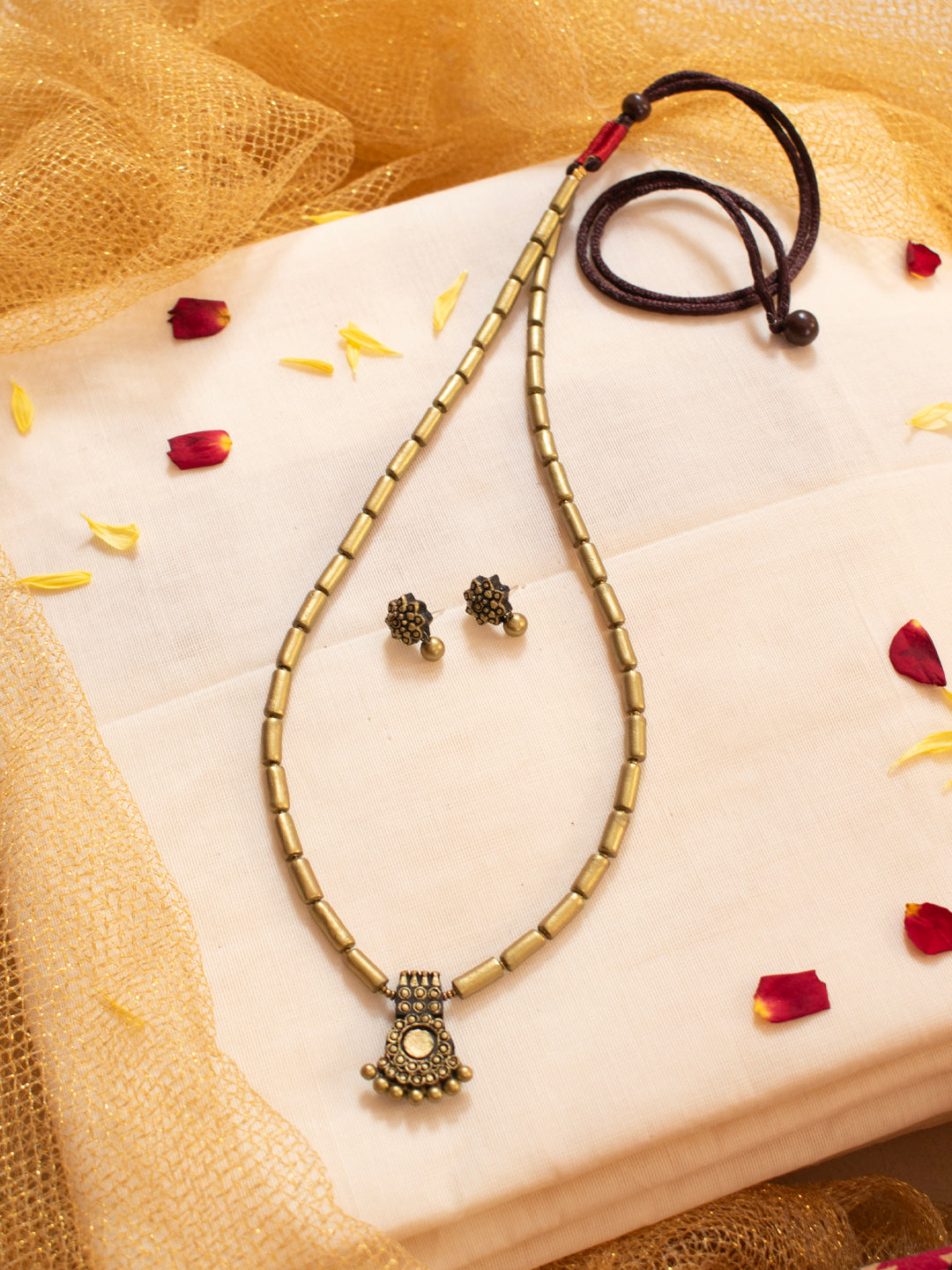 Handmade Terracotta Dual-Tone Round Ganesha Design Pendant Necklace with Antique Jhumka Earrings