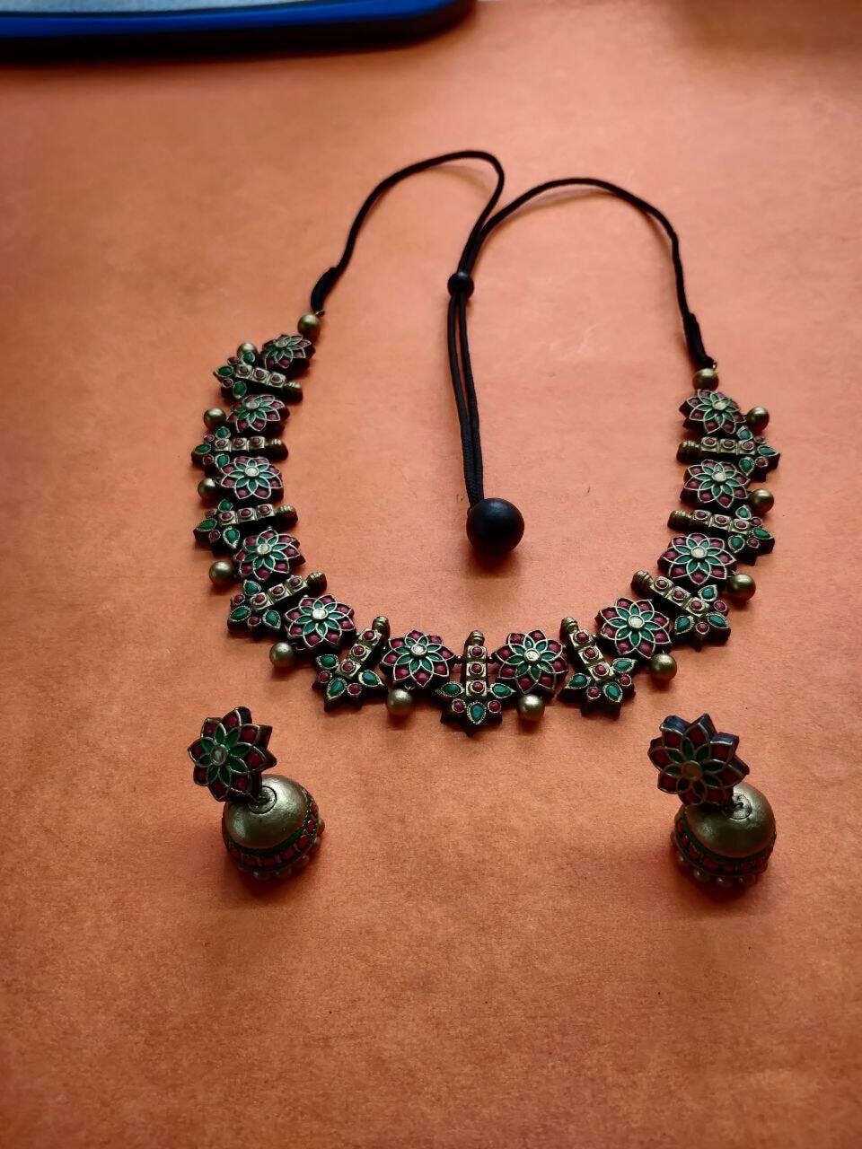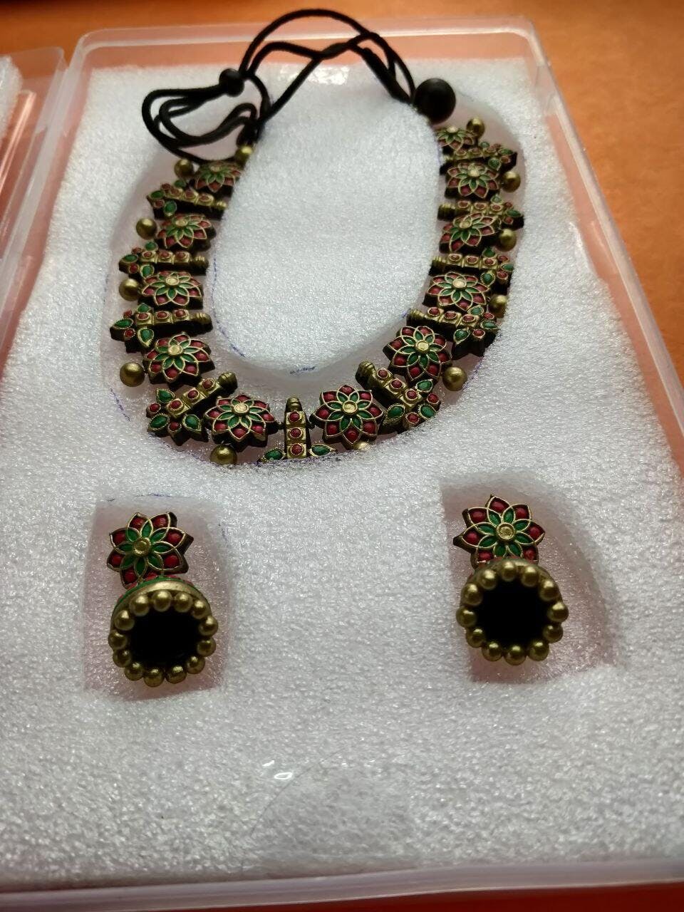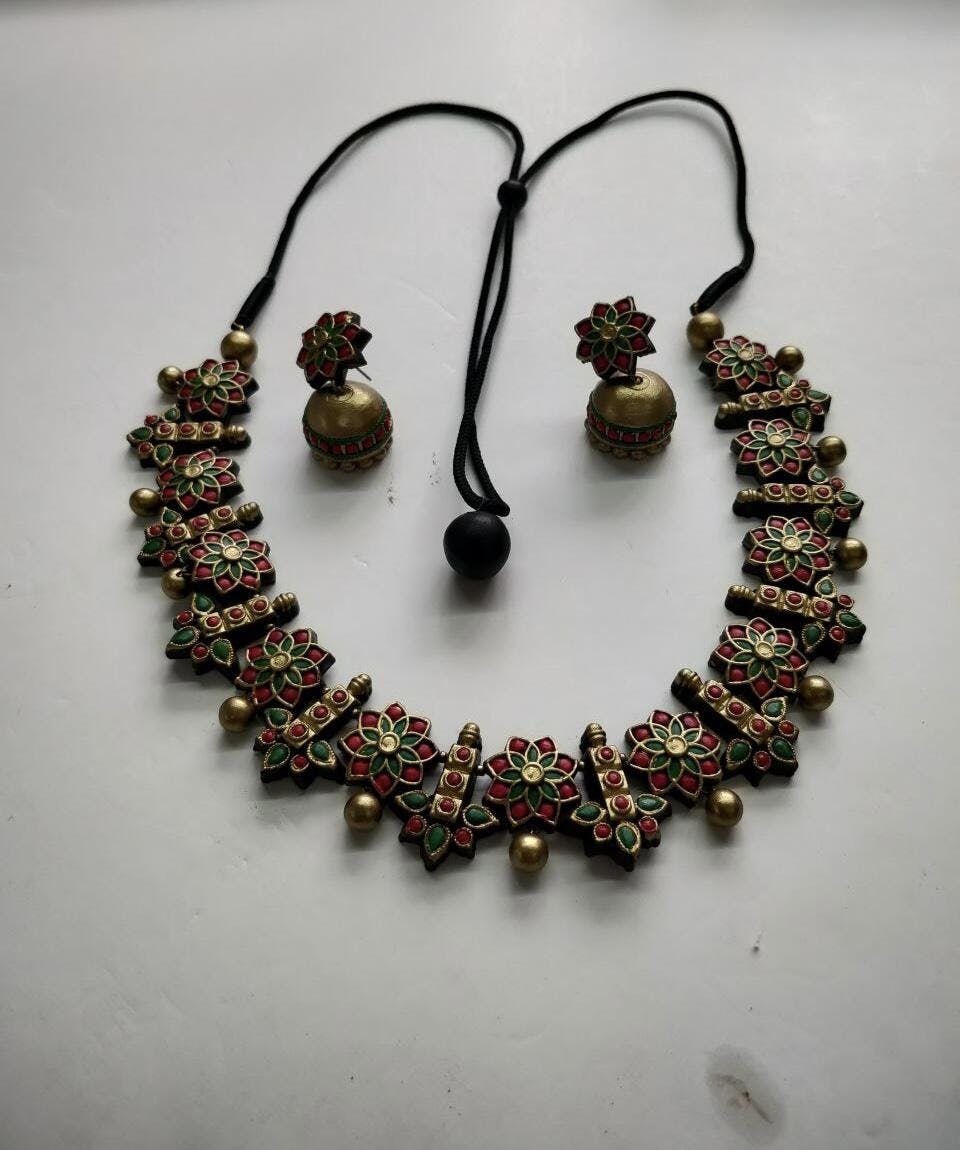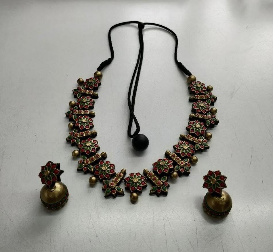Vasanti — Floral Design Antique Gold Green and Red Handmade Terracotta Necklace Set