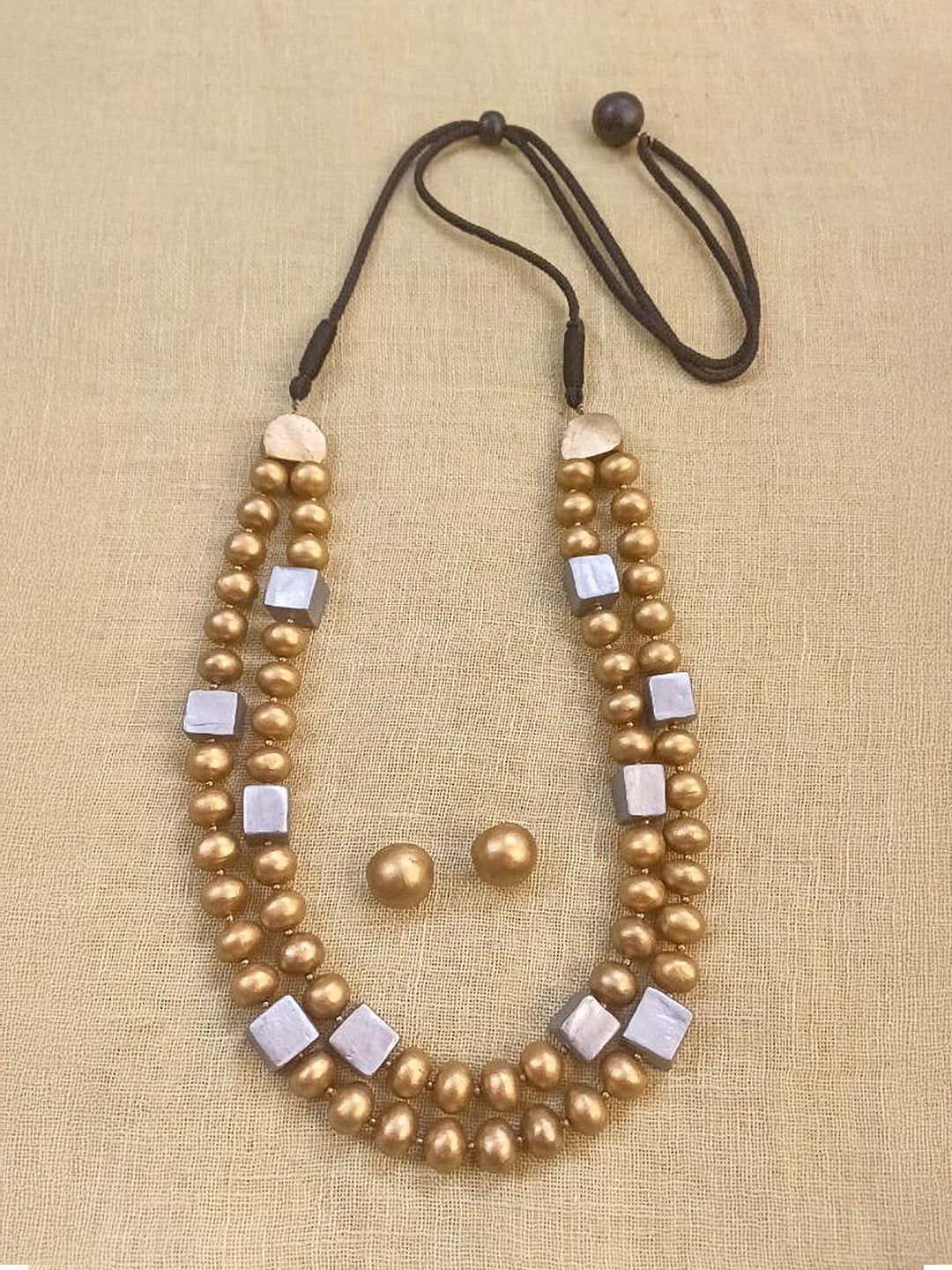 Terracotta Dual-Layer Gold and Silver Bead Necklace with Stud Earrings