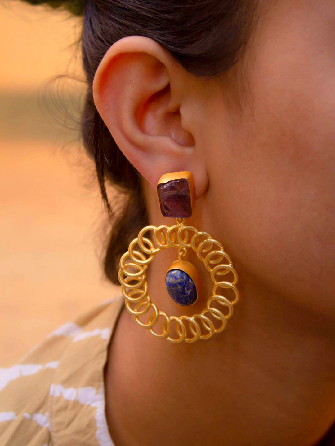 Avismaya Semi Precious Gold Plated Circle Design Blue Color Druzy Stone Dangler Earring