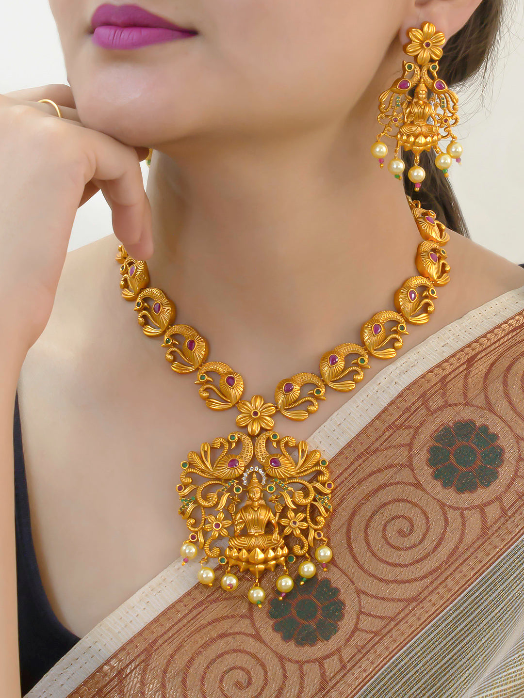 Avismaya Gold Plated Lakshmi Design Medium Haar Necklace Set With Kemp Stones