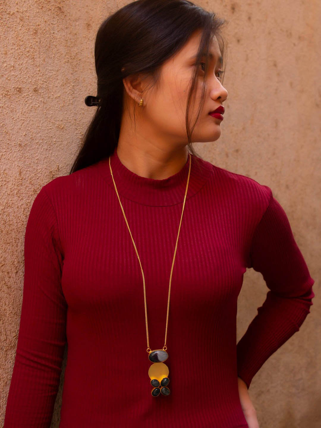 Avismaya Gold Plated Oval Shape Black And Gray Color Semi-precious Onyx Stone Coin Design Pendant Long Necklace