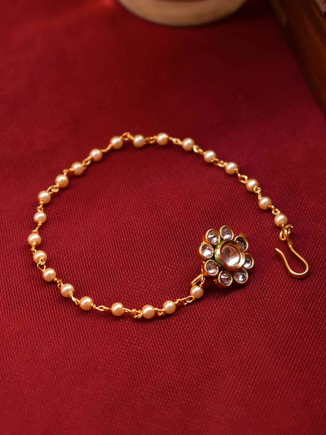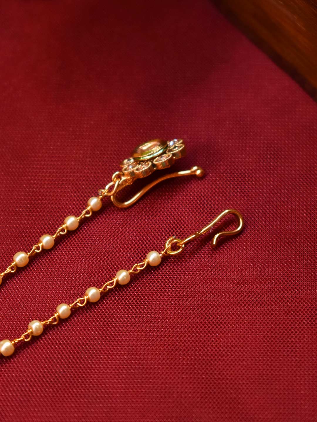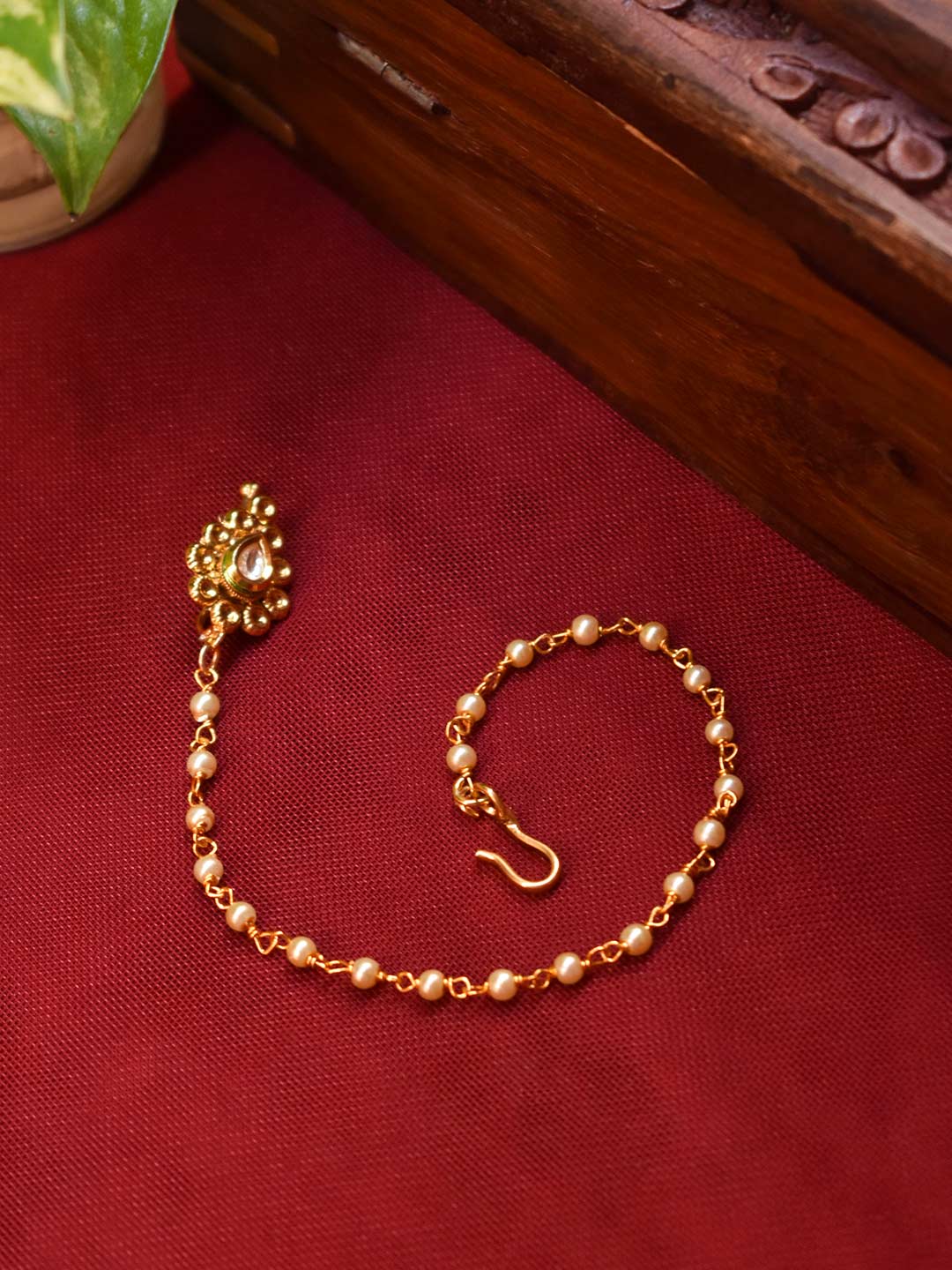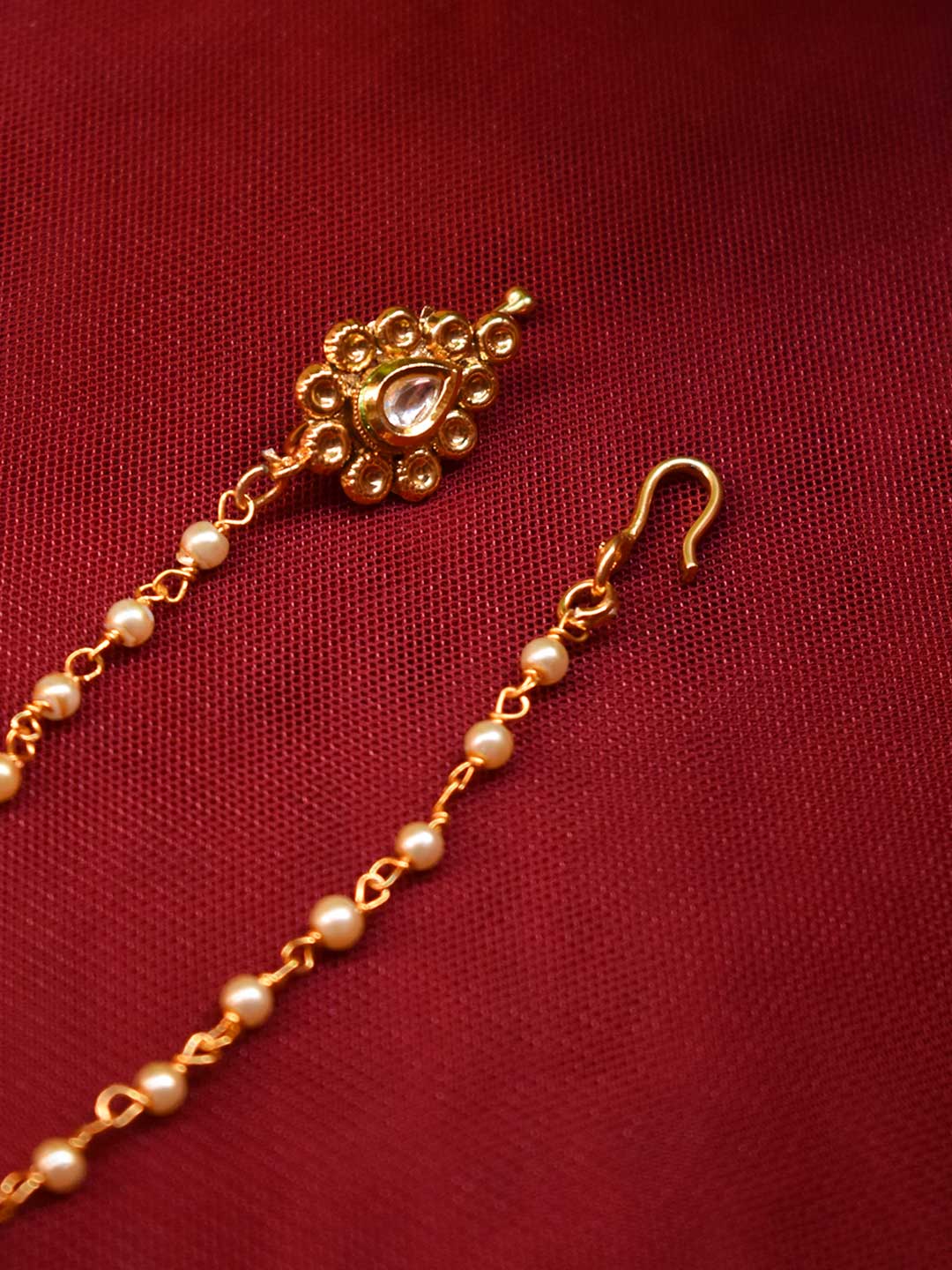 Designer Gold Plated Pearl Chain Half Moon Design Kundan Stones With Hanging Pearls Matha Patti