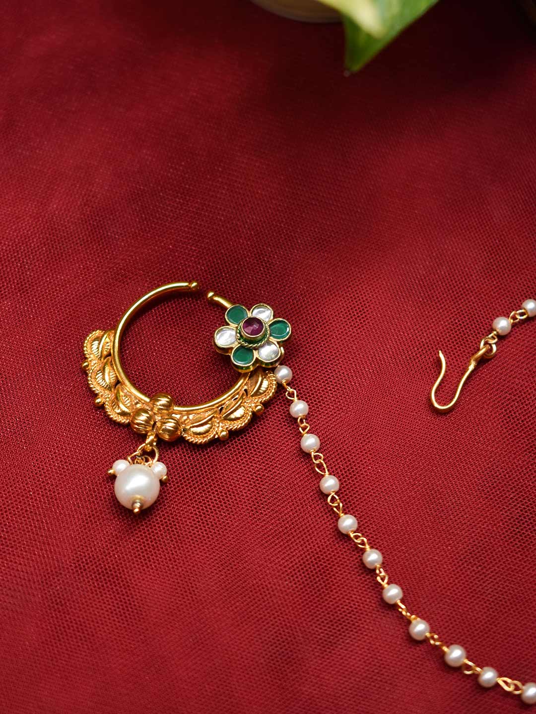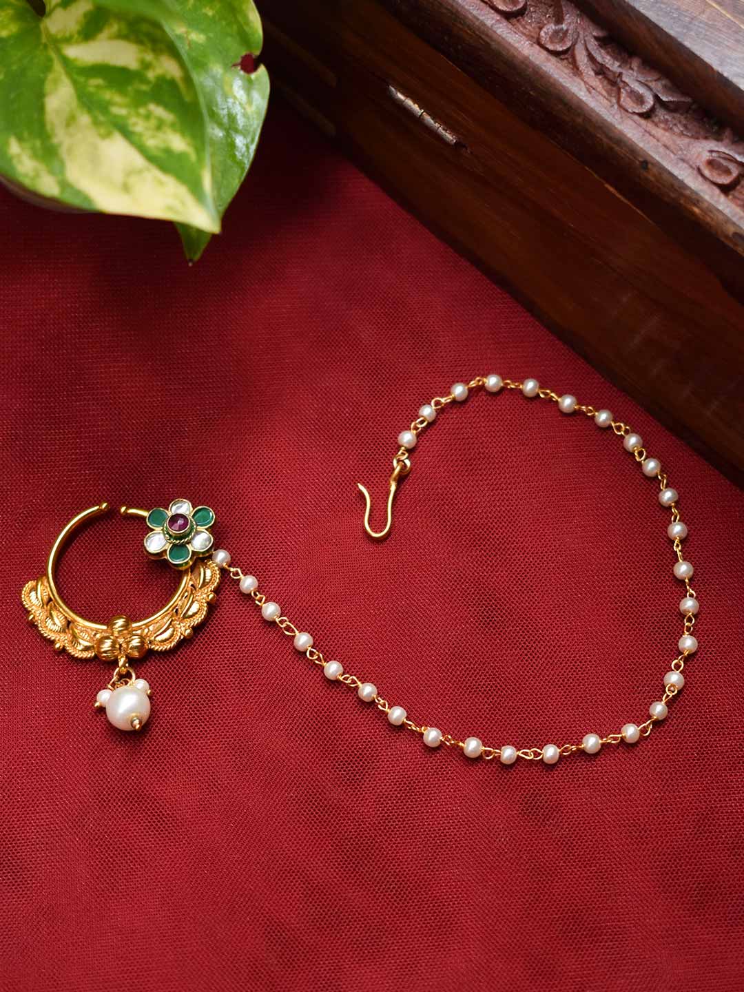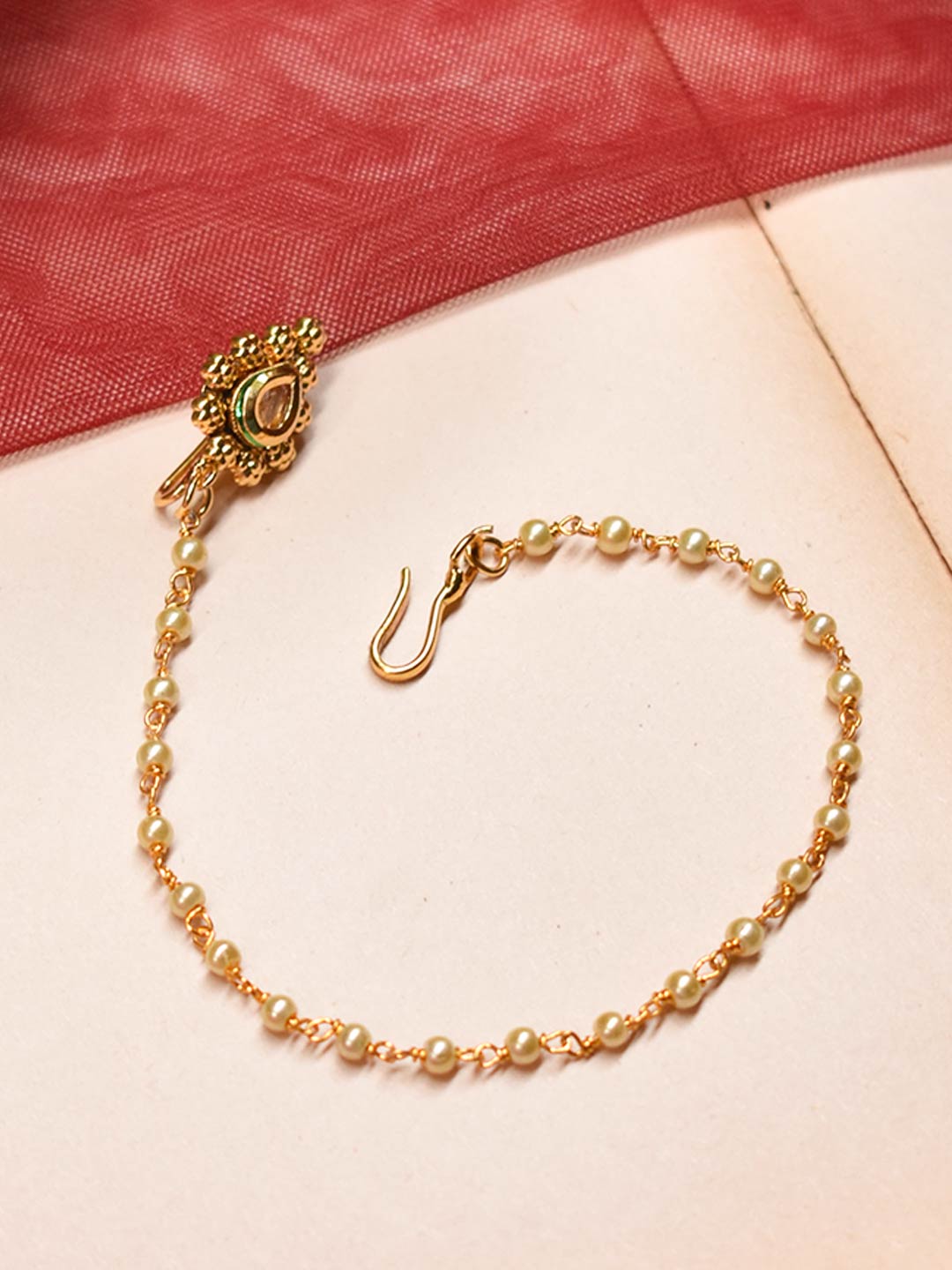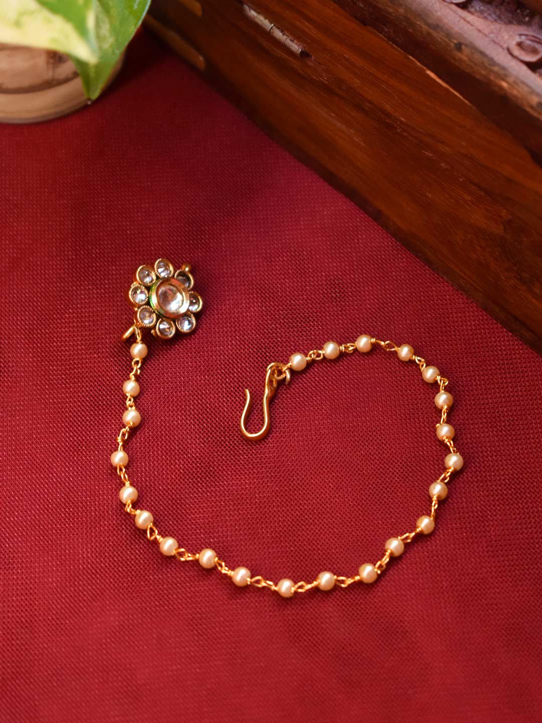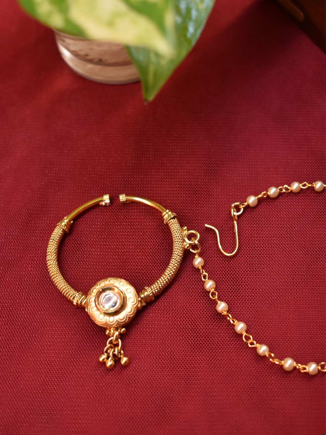Designer Gold Plated Pearl Chain Half Moon Design Kundan Stones With Hanging Pearls Matha Patti
