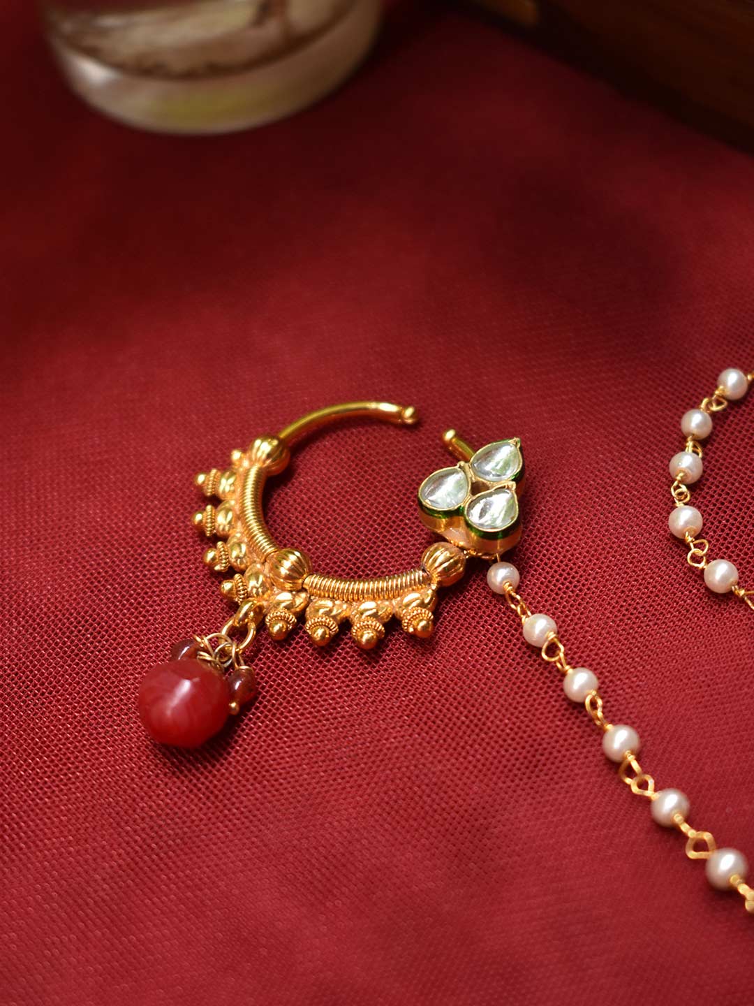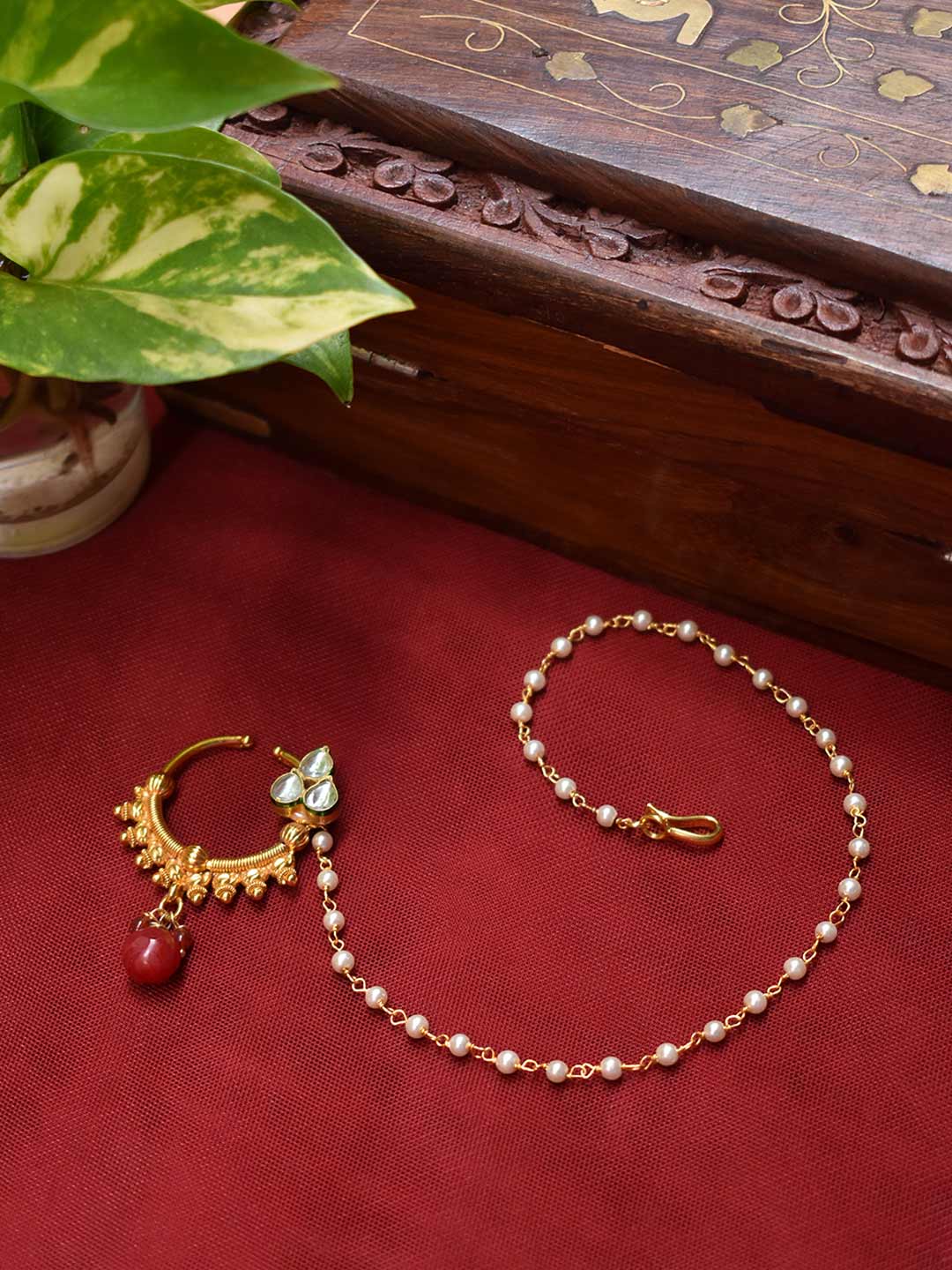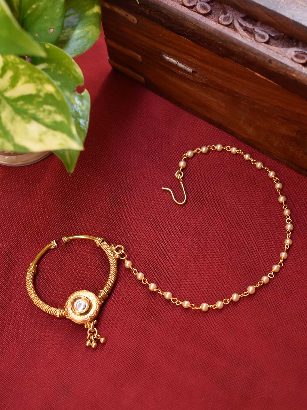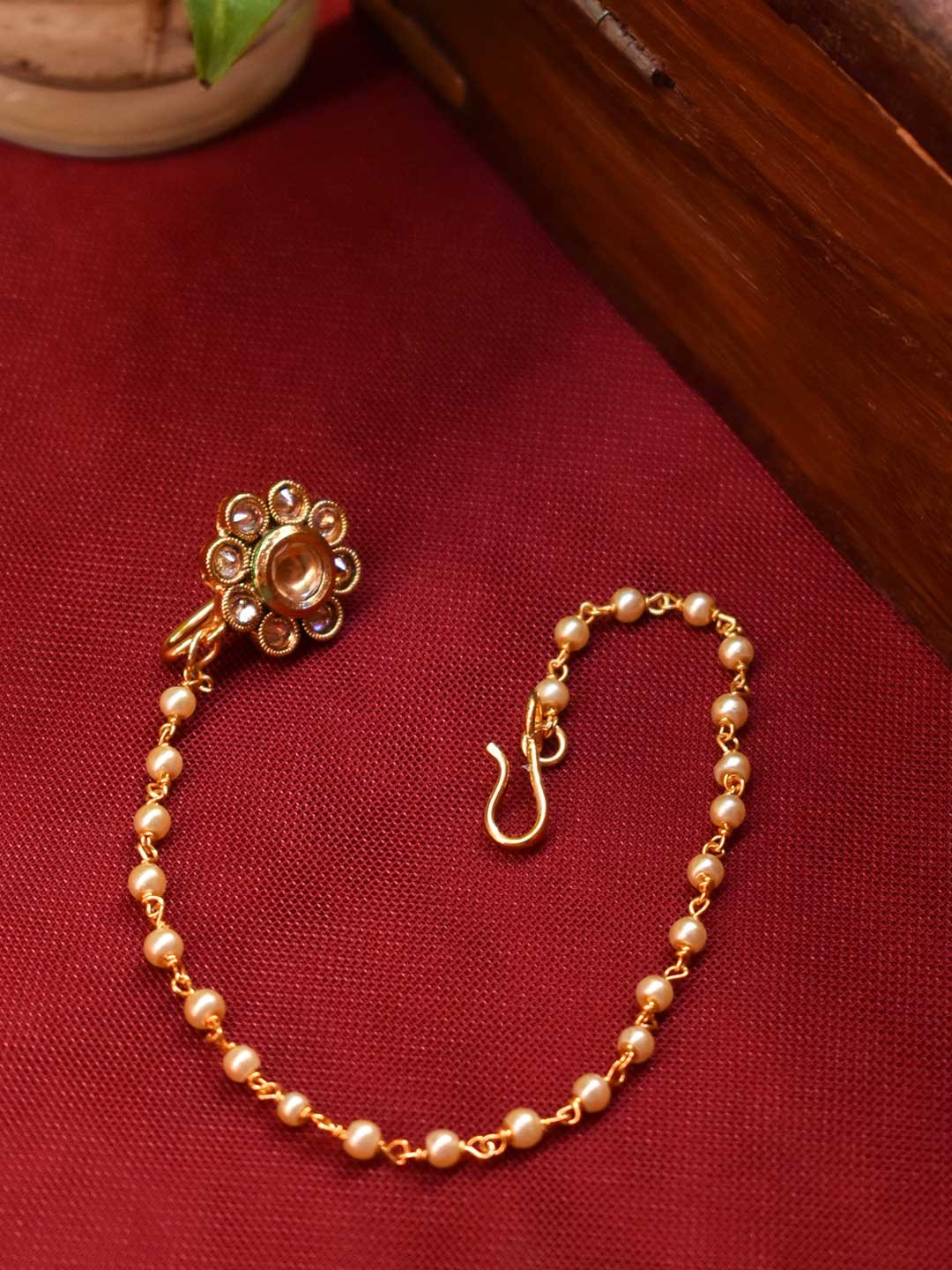 Designer Gold Plated Pearl Chain Half Moon Design Kundan Stones With Hanging Pearls Matha Patti