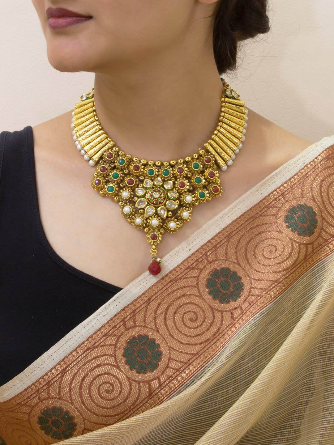 Antique Gold Square Circular Design Kundan Fusion Handmade Terracotta Necklace Set