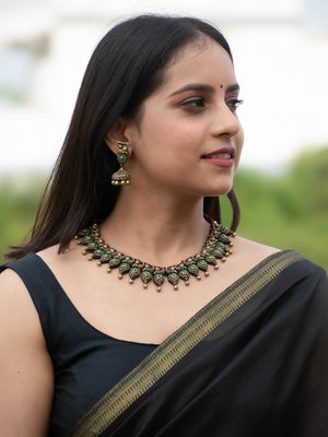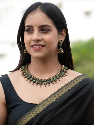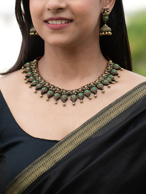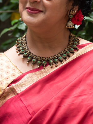Antique Gold Red Green Peacock Leaf Design Handmade Terracotta Necklace Set