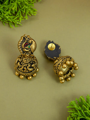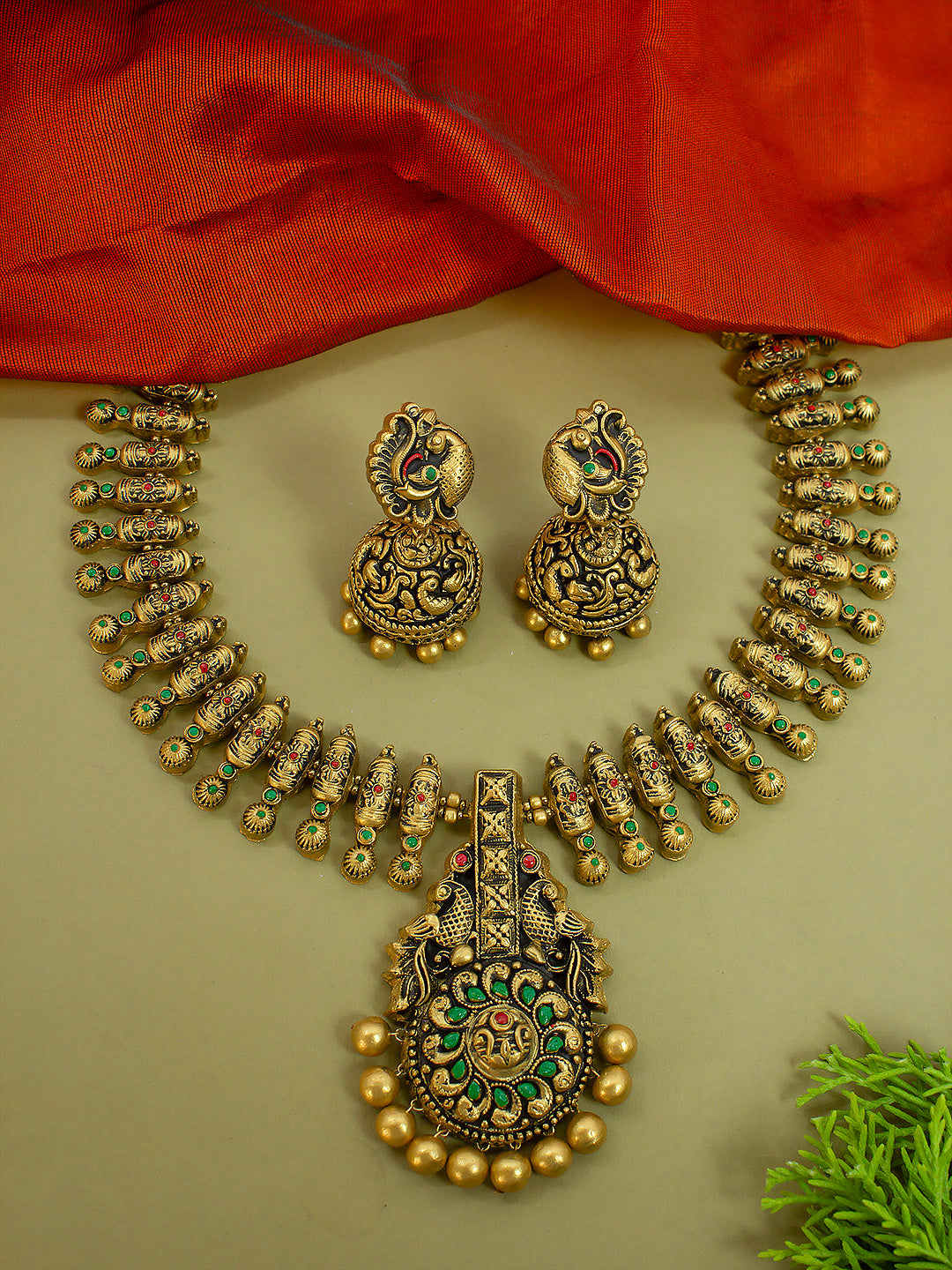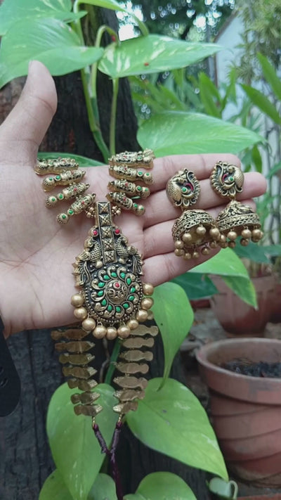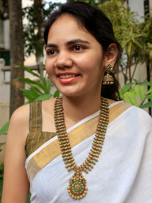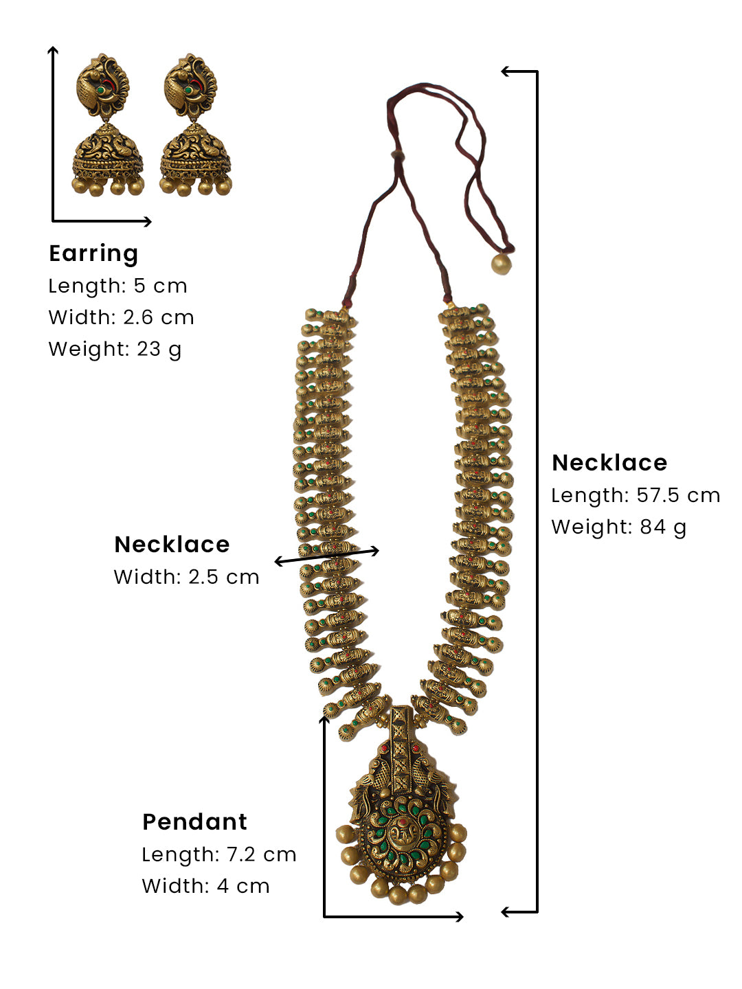 Temple Art Design Peacock Bridal Antique Gold Red Green Long Haram Handmade Terracotta Necklace Set