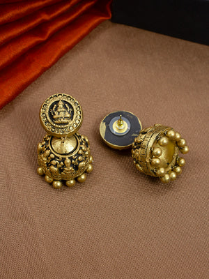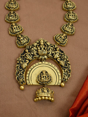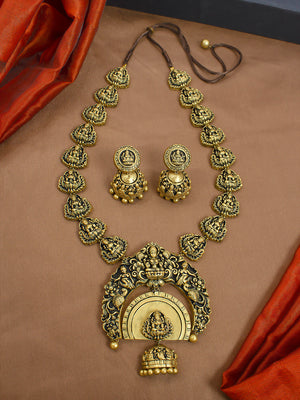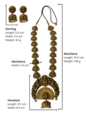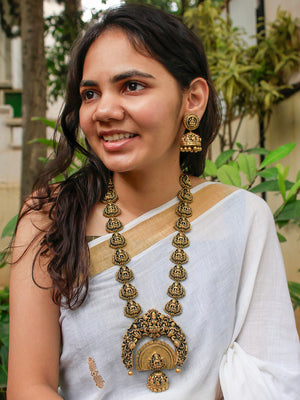 Antique Gold Lakshmi Design Jhumka Pendant Style Long Haram Handmade Terracotta Necklace Set