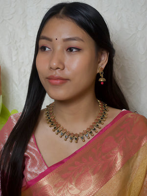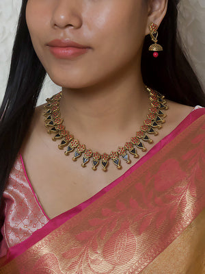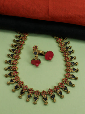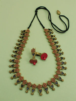 Antique Gold Black Pink Floral Leaf Design Handmade Terracotta Necklace Set