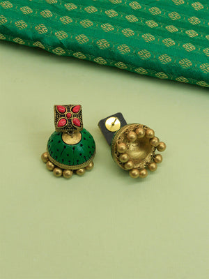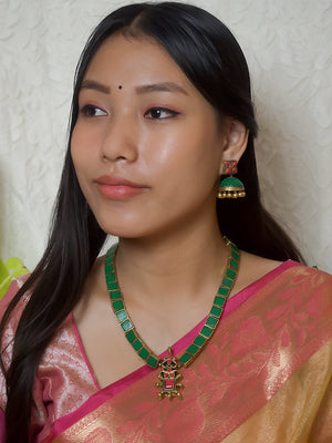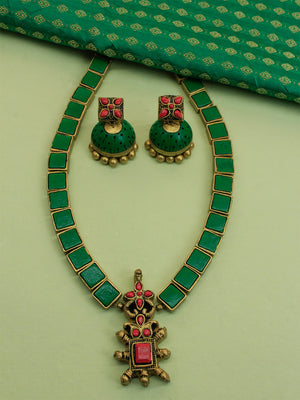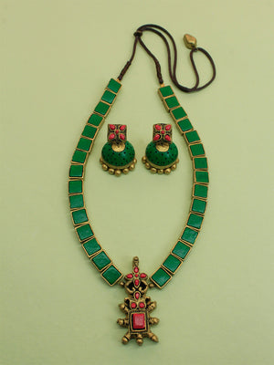 Green Antique Gold Pink Square Geometric Design Handmade Terracotta Necklace Set