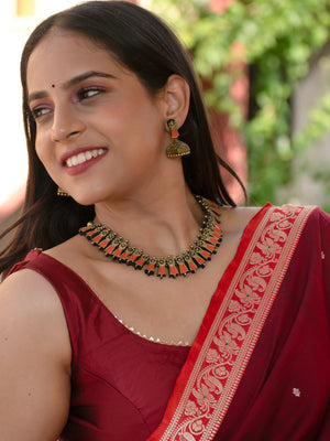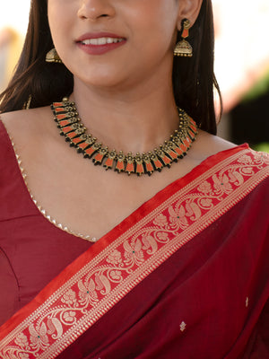 Orange Cadmimum Red Antique Gold Fringe Pattern Handmade Terracotta Necklace Set