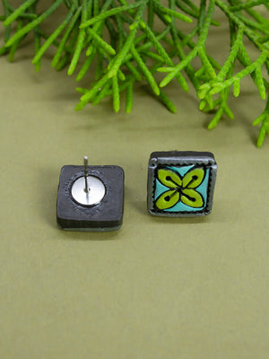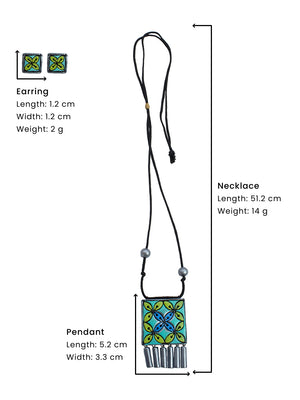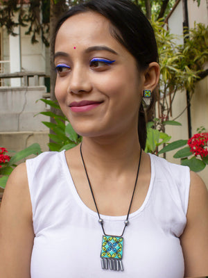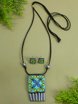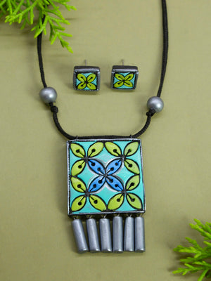 Turquoise Yellow Blue Grey Square Shape Floral Design Pattern Handmade Terracotta Necklace Set