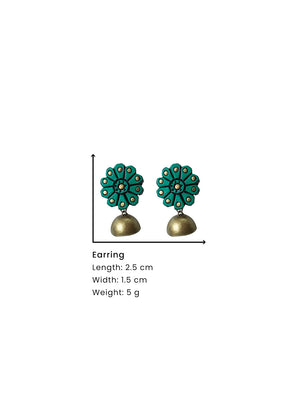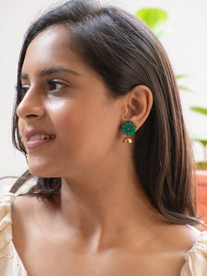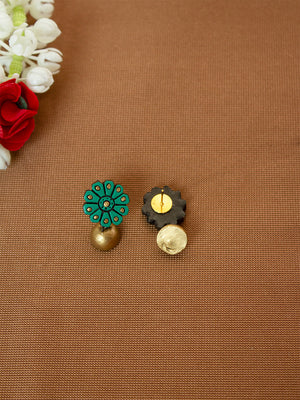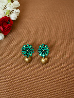 Emerald Green and Gold Flower Design Hand-Painted Terracotta Earrings