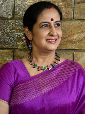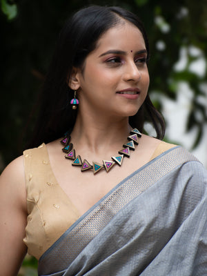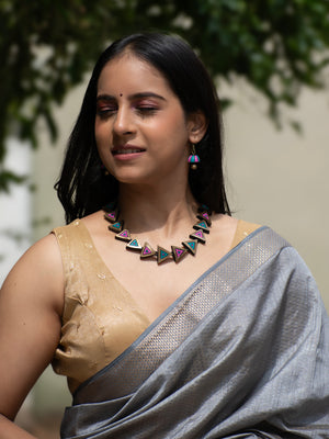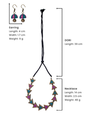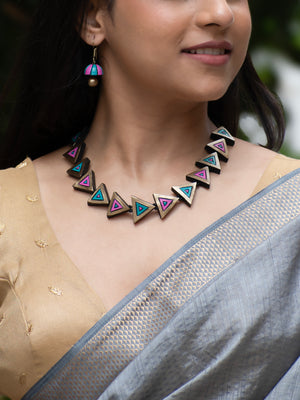 Pink Blue and Gold Triangular Design Minimalistic Handmade Terracotta Necklace Set