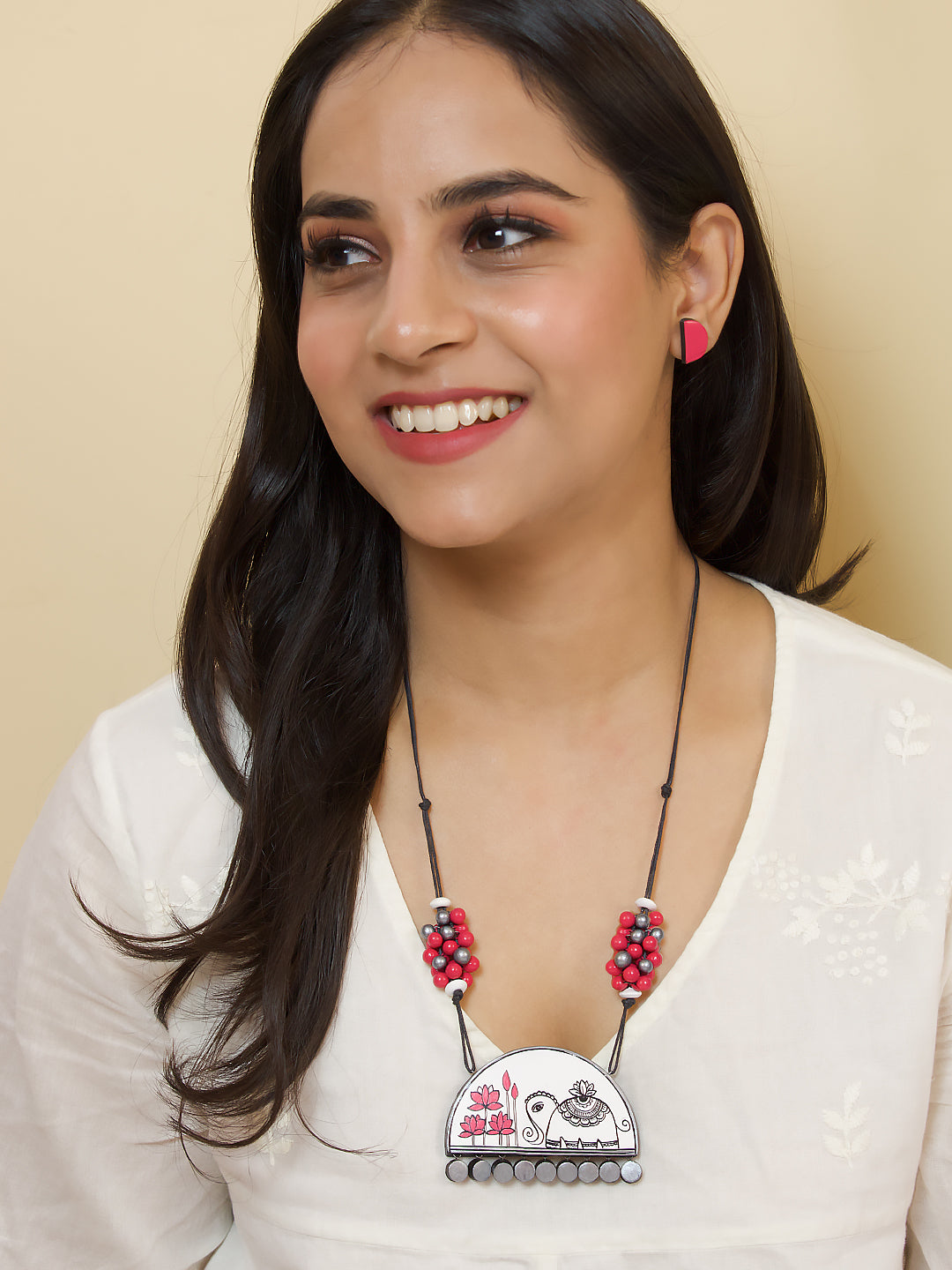 Silver White Pink Semi-circle Pendant with Elephant Art Work Ghungroo Style Handmade Terracotta Necklace Set