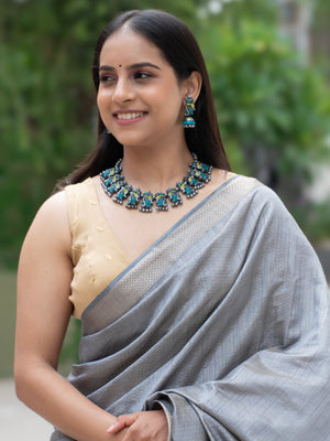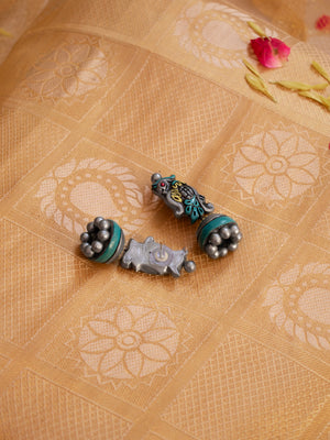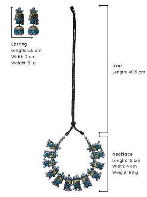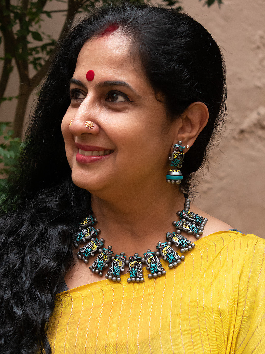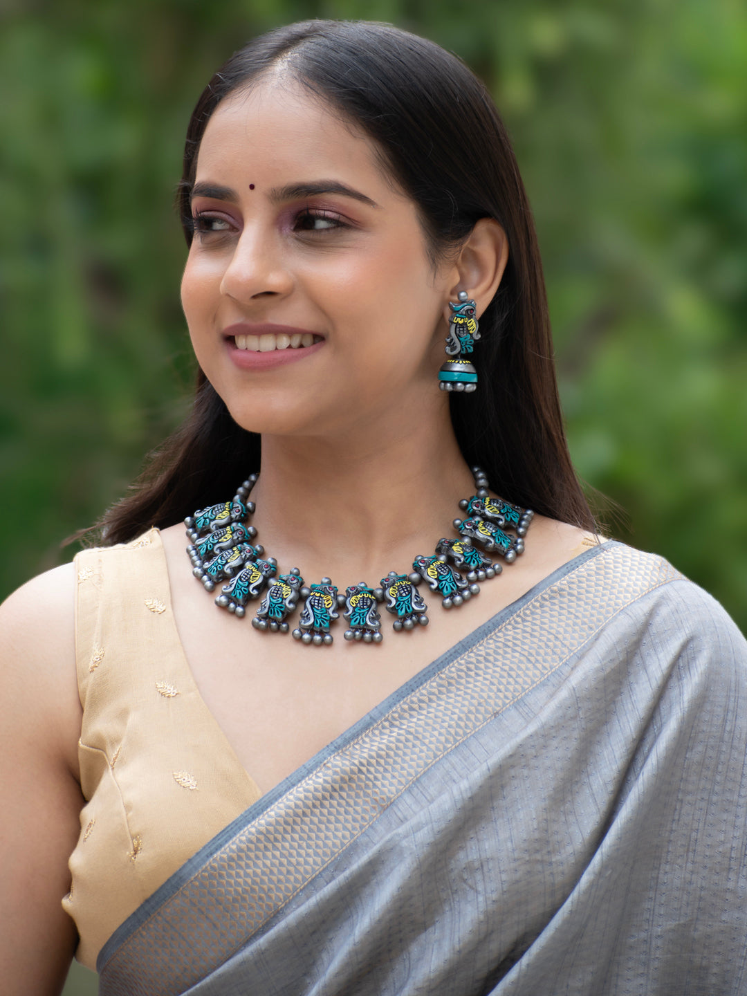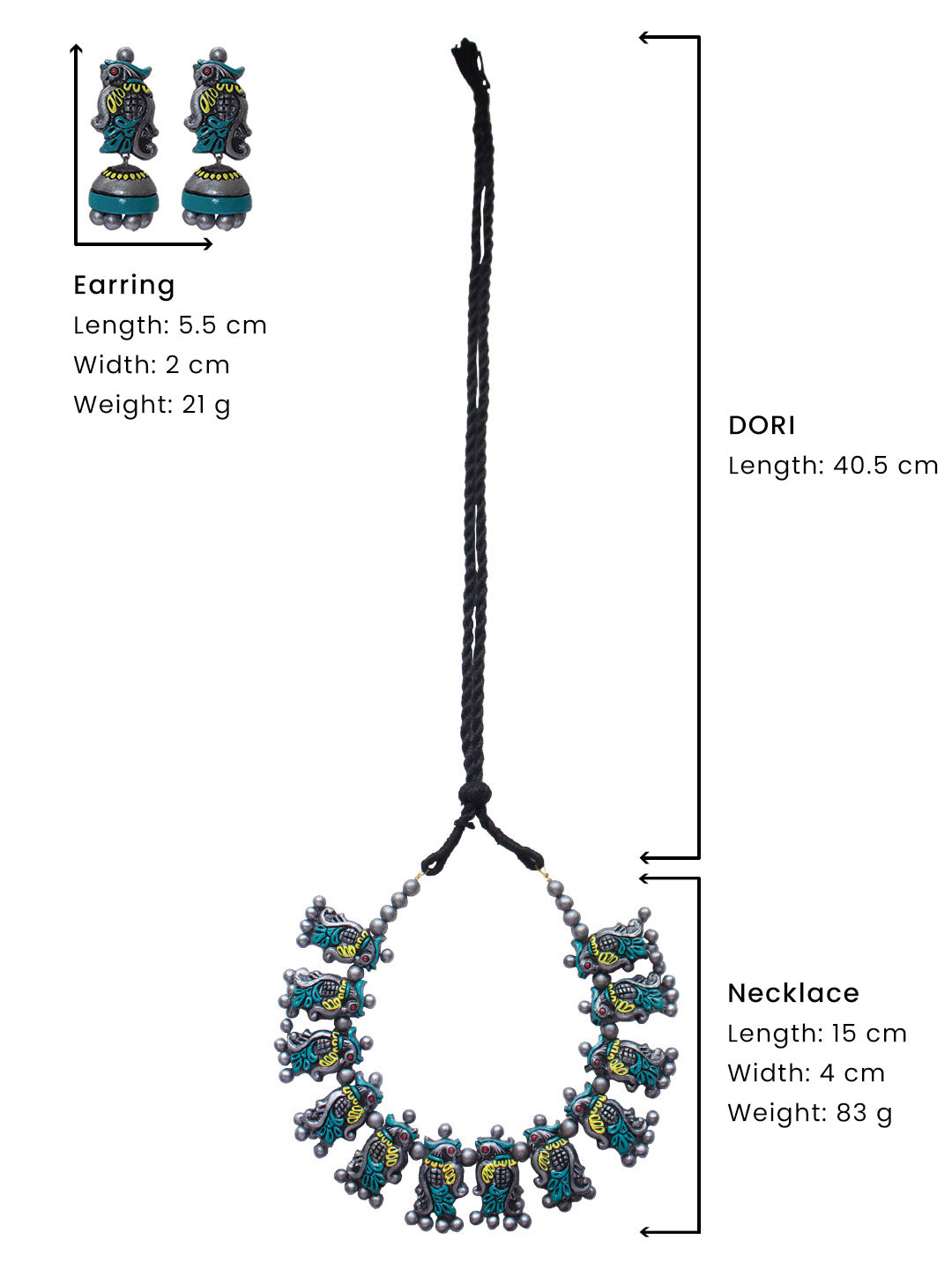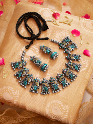 Teal, Yellow and Silver Peacock Design Handmade Terracotta Necklace Set