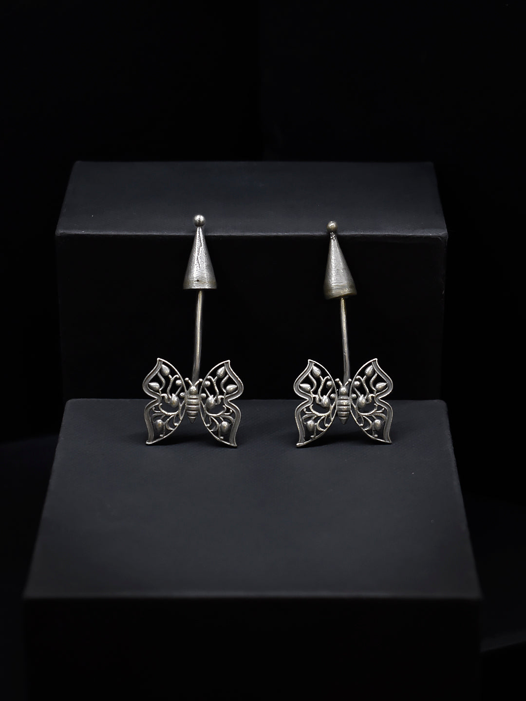 Silver Plated Floral Design Stud With Hanging White Pearls Jhumka Earring