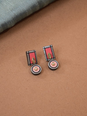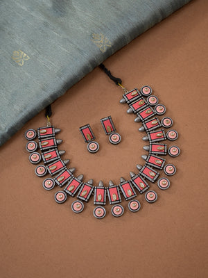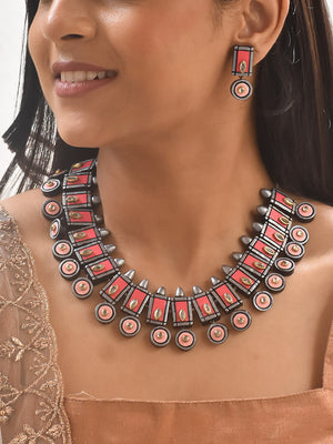 Handcrafted Terracotta Statement Necklace Set with Pink and Antique Silver & Matching Earrings