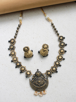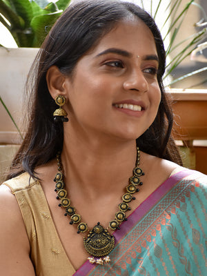 Handcrafted Temple Design Motif Terracotta Jewellery Set in Black & Antique Gold