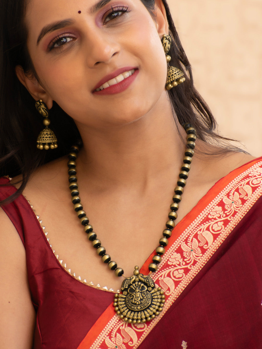 Antique Gold Lakshmi Design Pendant Mala Handmade Terracotta Necklace Set