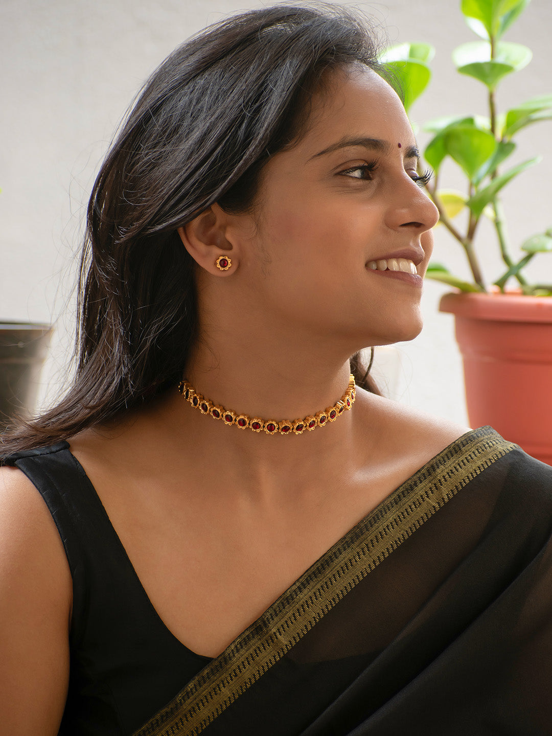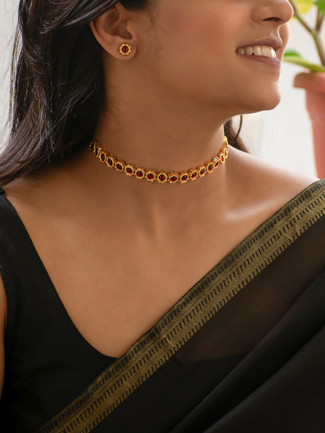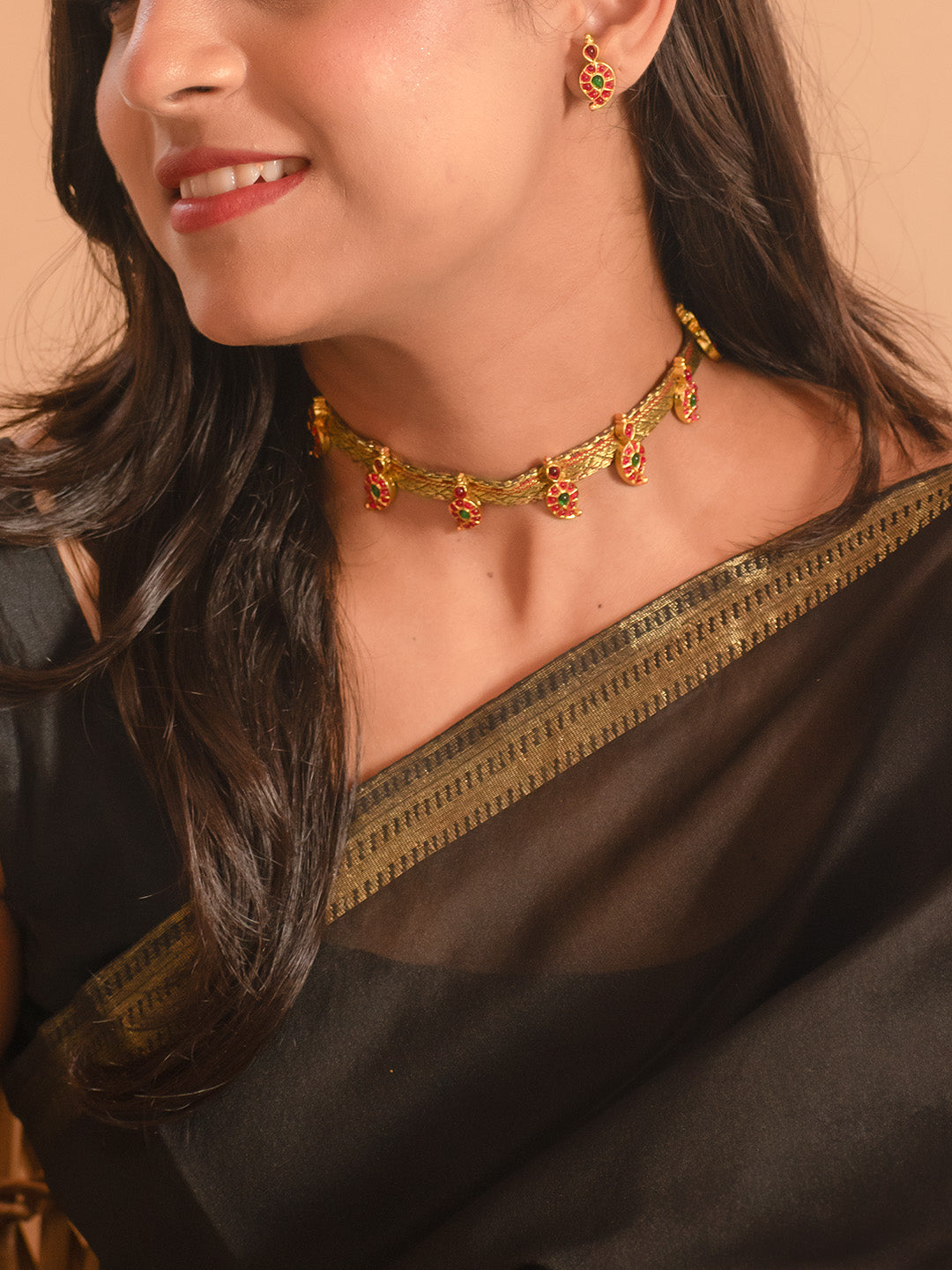 Premium Gold Finish Red and Green Kemp Stone Temple Necklace with Gold Chain