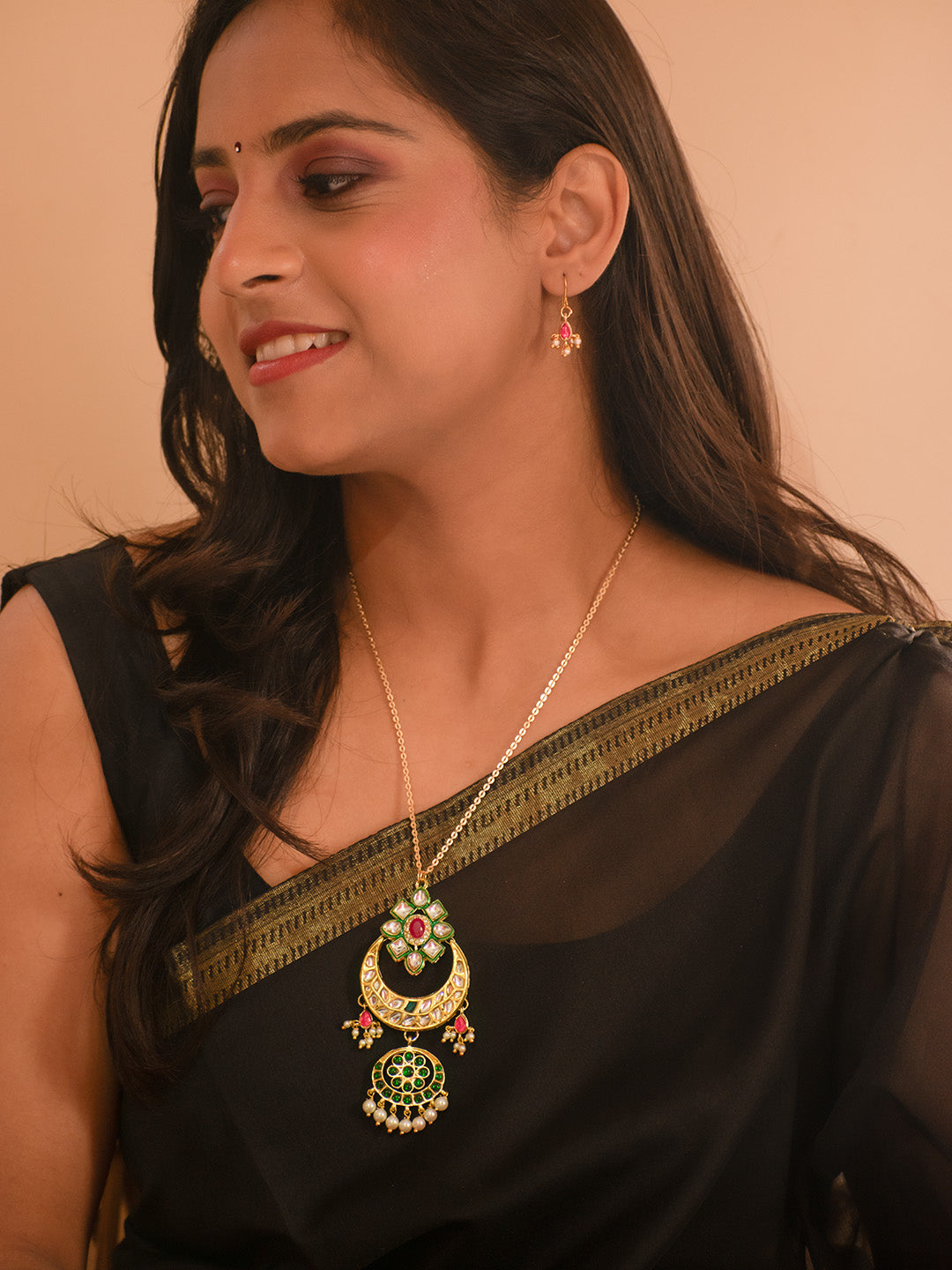 Premium Gold Finish Red Green Kundan Kemp Stone Metal Chain Necklace Set