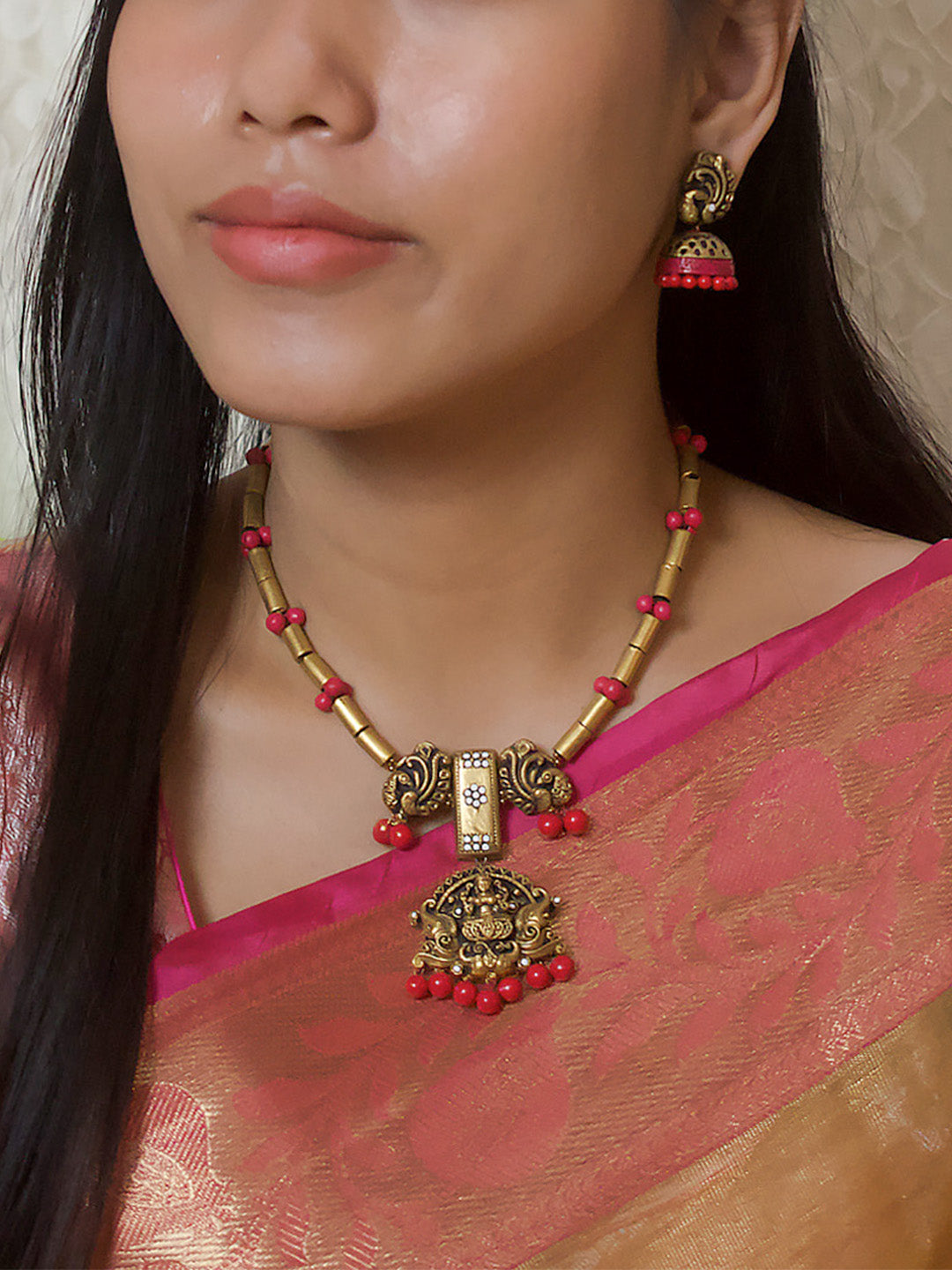 Rudrabali – Handmade Terracotta Temple Necklace Set with Red Disc Beads and Antique Gold Engraved Pendant