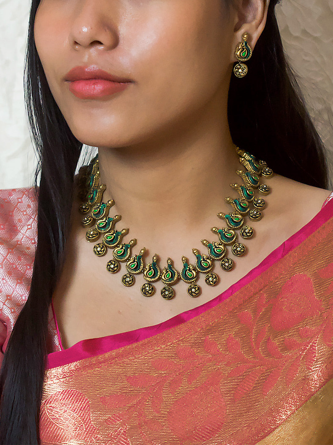 Antique Gold Toned Circular Shape Peacock Design Motifs Red And Green Color Terracotta Choker Necklace Set