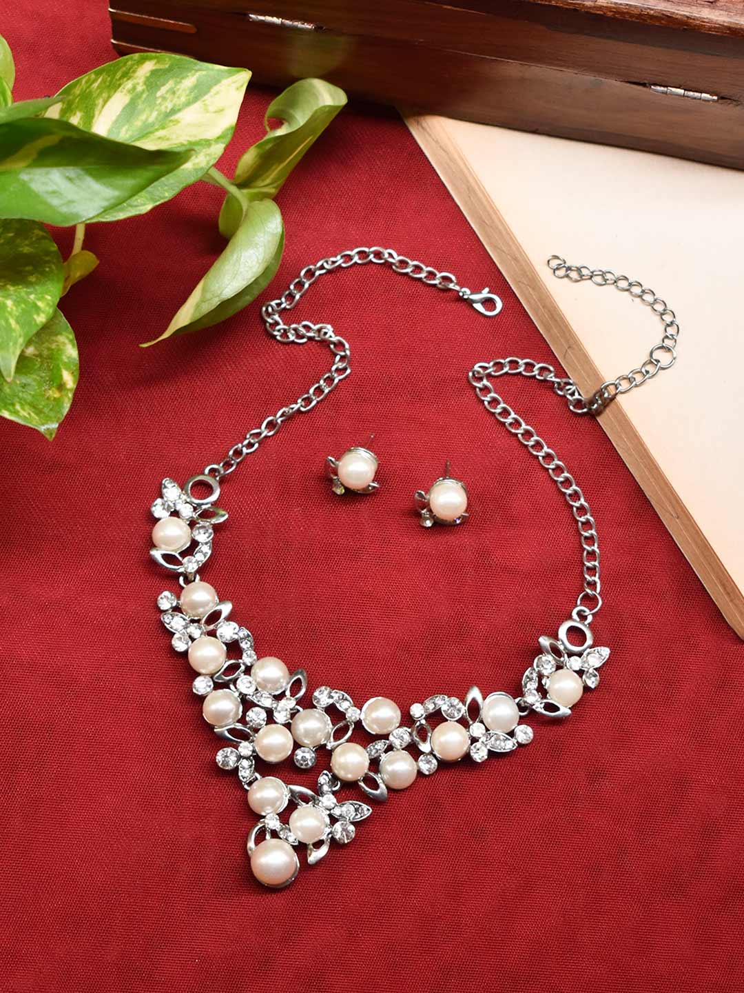 Silver Plated Tear Drop Shape And Circular Shape Ad Stones And Pearls Choker Necklace Set