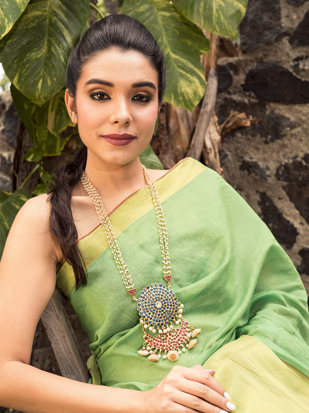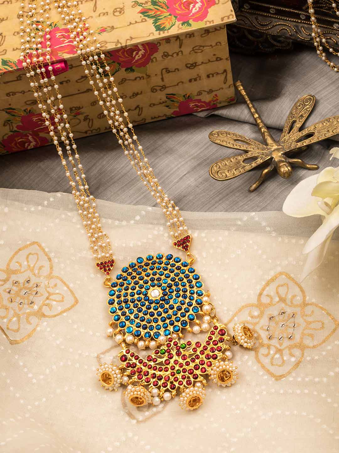 Designer Contemporary Peacock Design 5 Layered Pearl Chain With Double Pendant Long Necklace