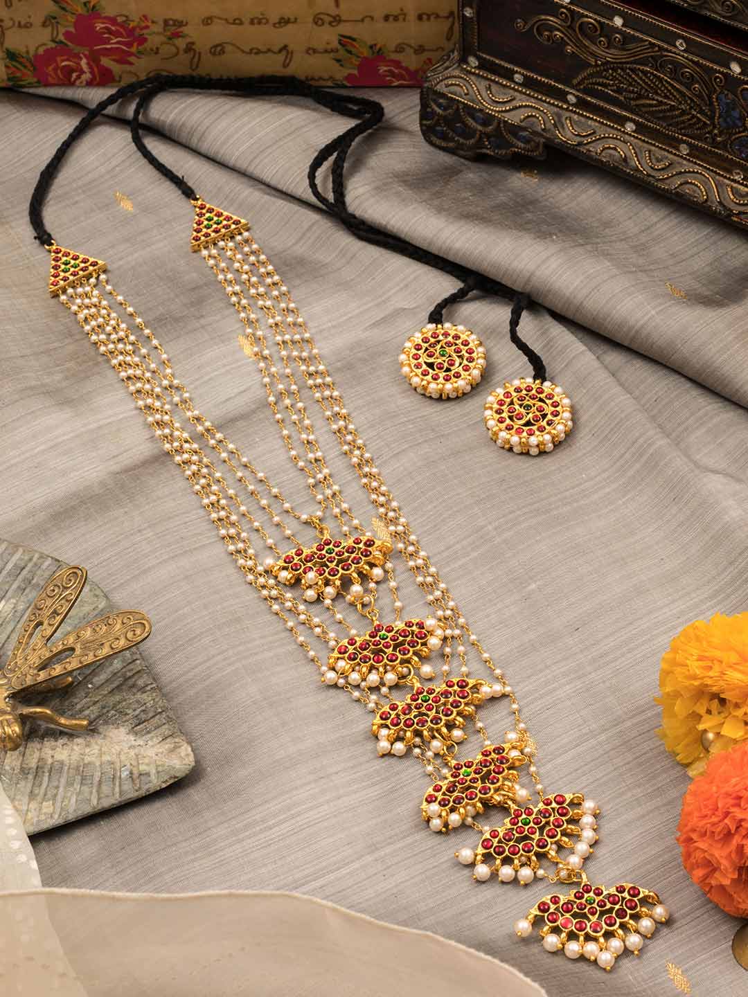 Designer Contemporary 5 Layered Pearl Chain With Double Pendant Long Necklace