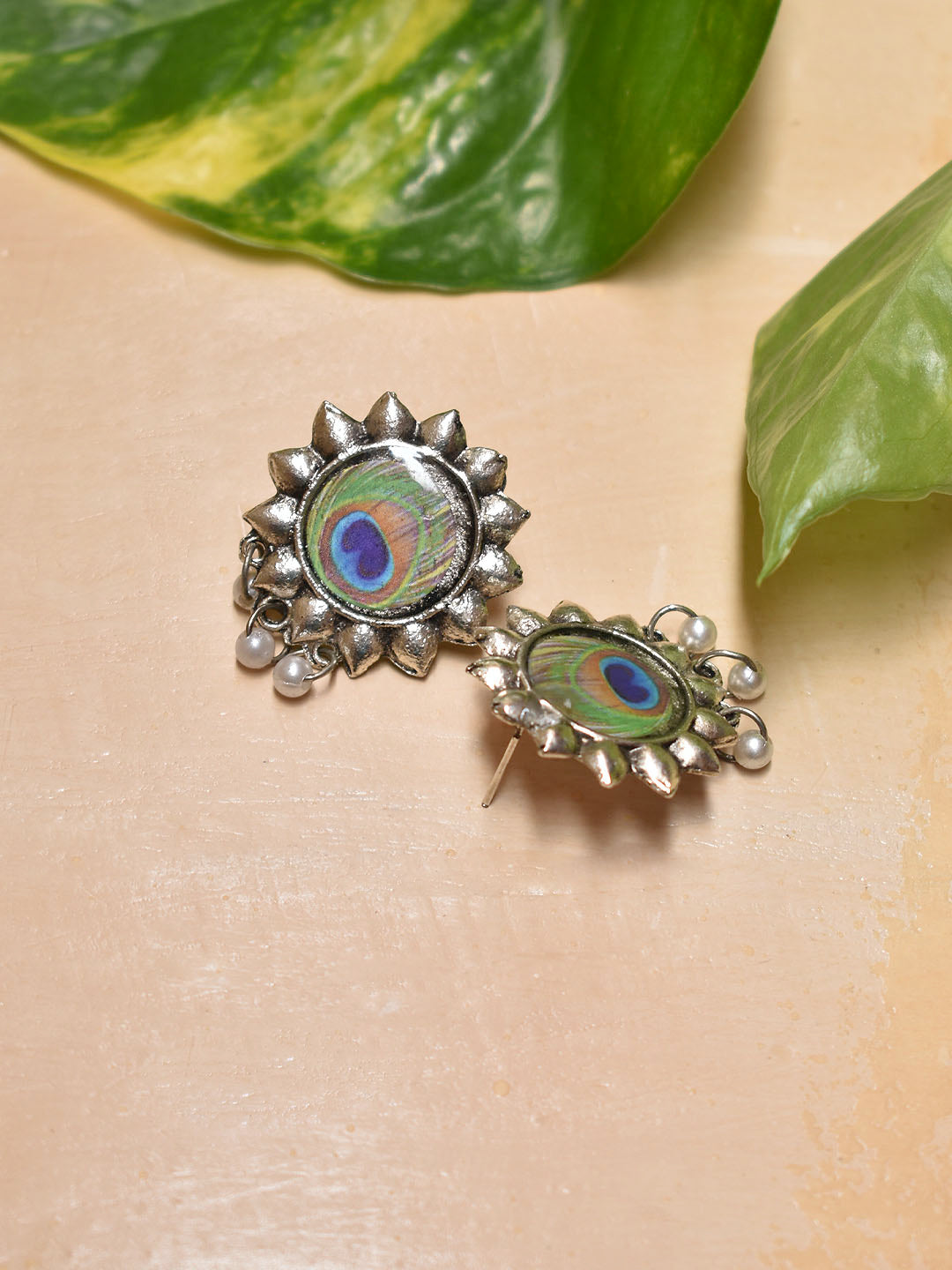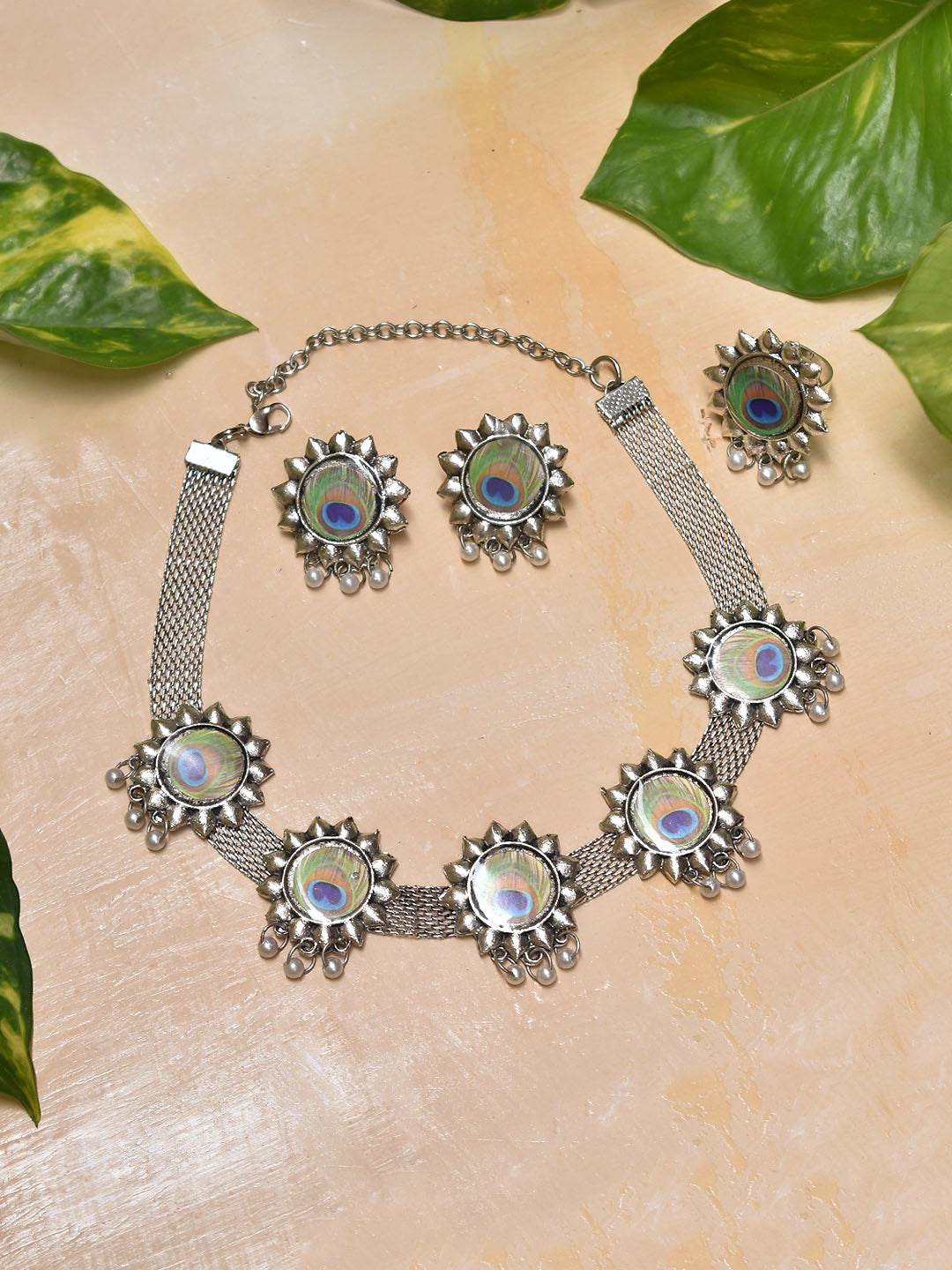 Silver Plated Sun Design Peacock Feather Printed With Hanging Pearls Choker Necklace Set