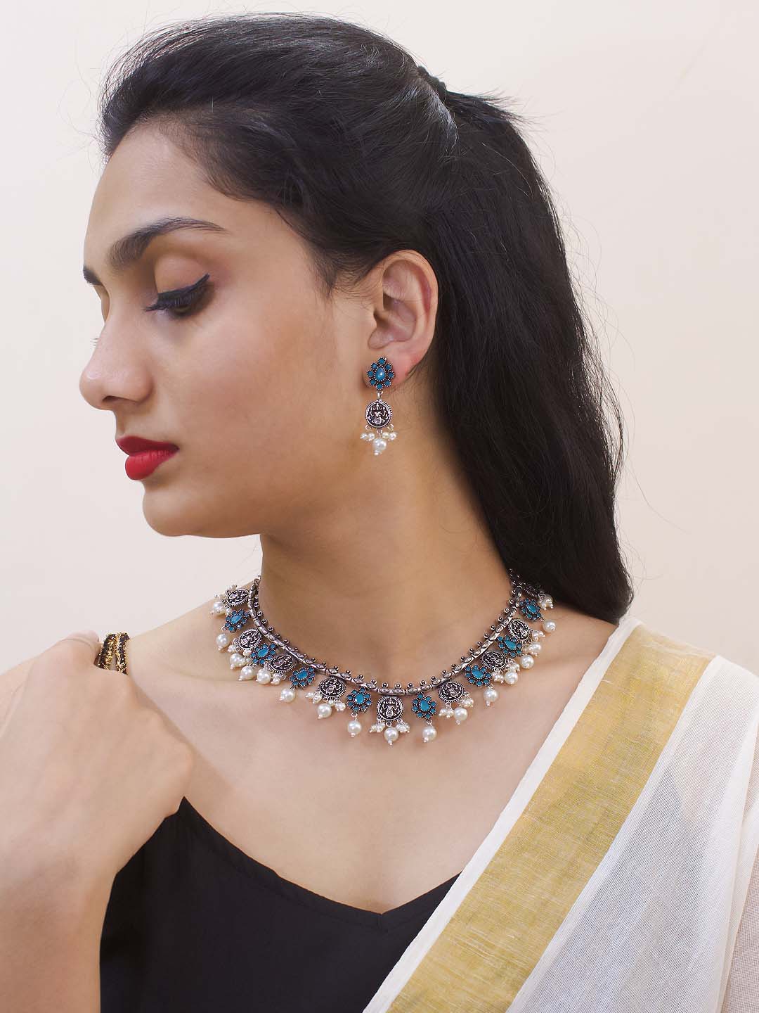 Silver Plated Lakshmi Coin Design And Black Color Floral Design Stones With Pearl Droppings Choker Necklace Set