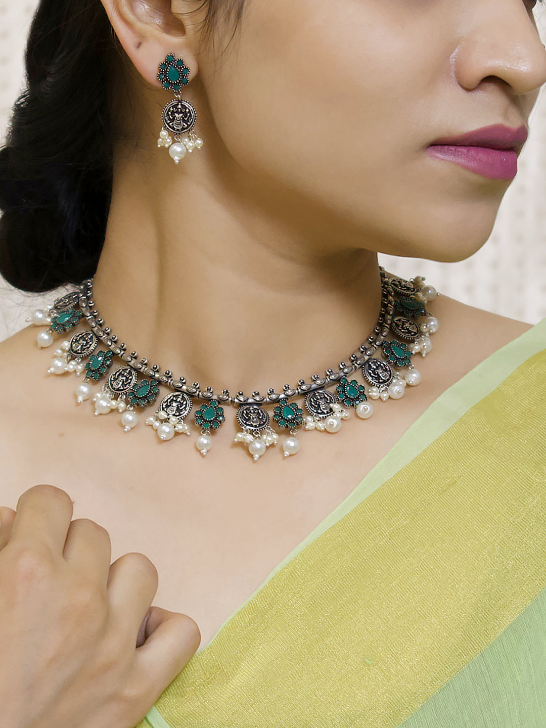 Silver Plated Lakshmi Design Coins Green Color Artificial Stone With Hanging White Pearls Necklace Set For Women