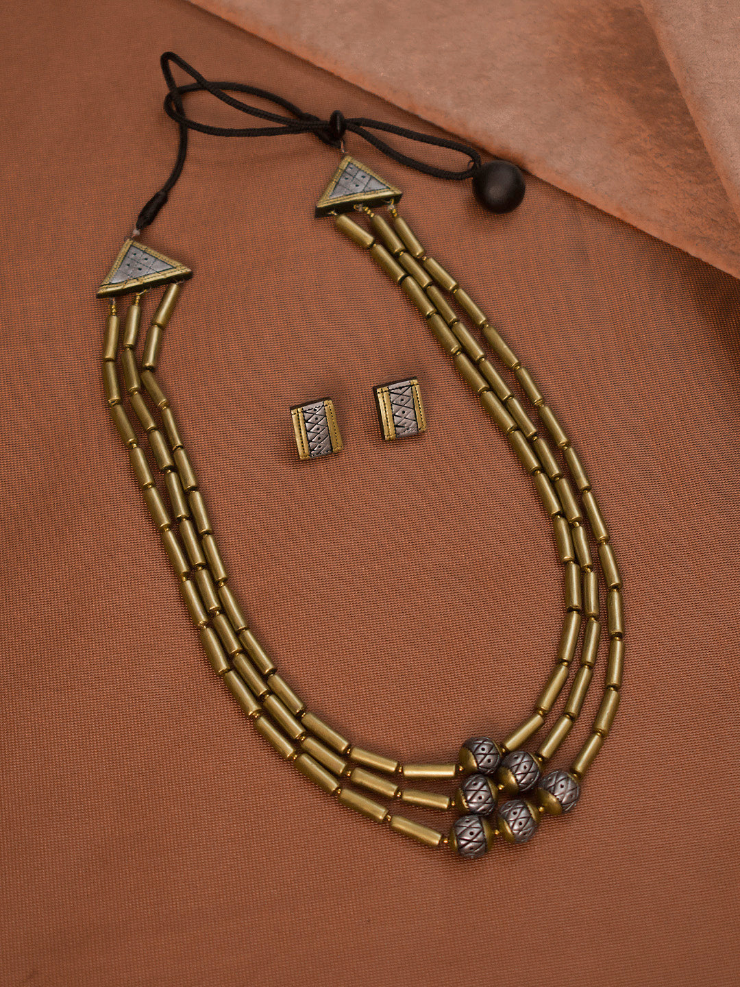 Tribhujika — Antique Gold Toned Three Layered Cylindrical Tubes Long Handmade Terracotta Necklace Set