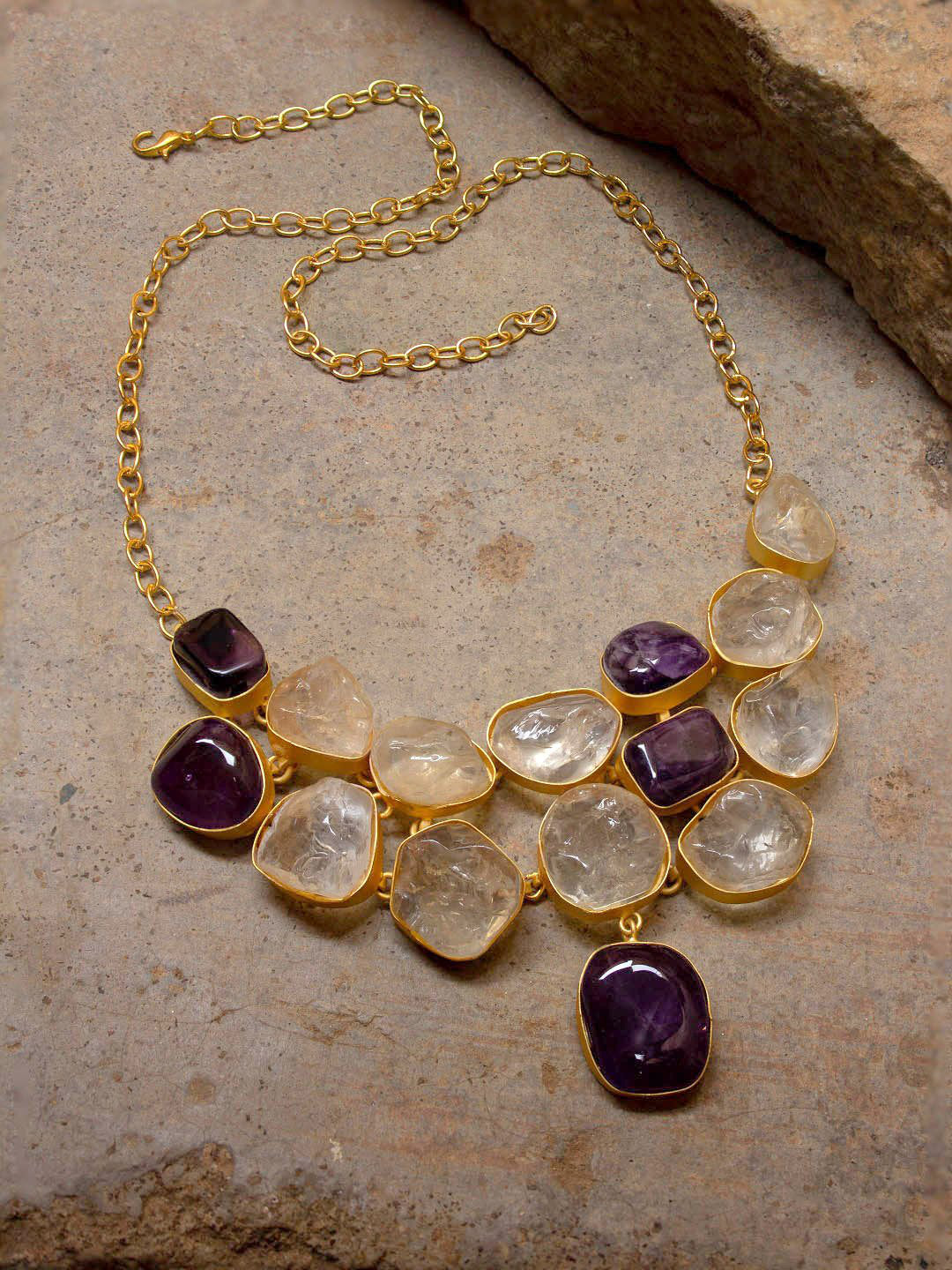 Avismaya Gold Plated Circle Design Semi Precious White And Purple Color Solar Druzy And Monalisa Mix Stone Choker Necklace