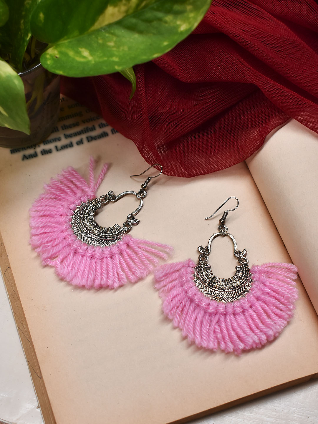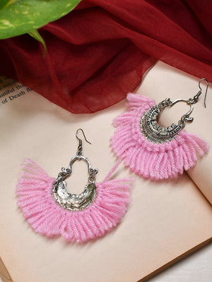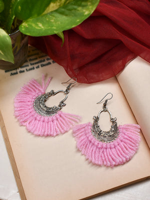 Silver Plated Halfmoon Design With Hanging Pink Color Threads Dangler Earring
