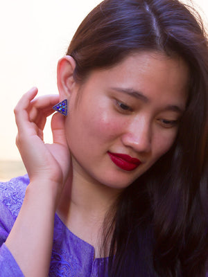 Silver Plated Triangle Shape Design Navy And Teal Color Enamel Painted Stud Earring