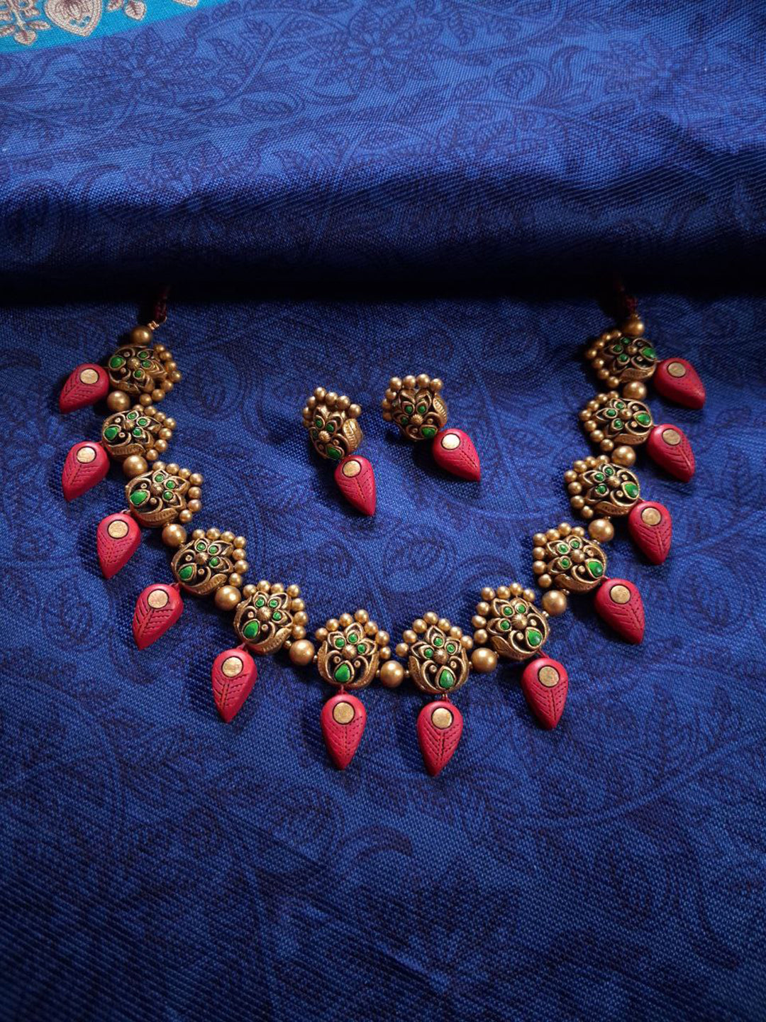Antique Floral Terracotta Necklace Set with Leaf Accents