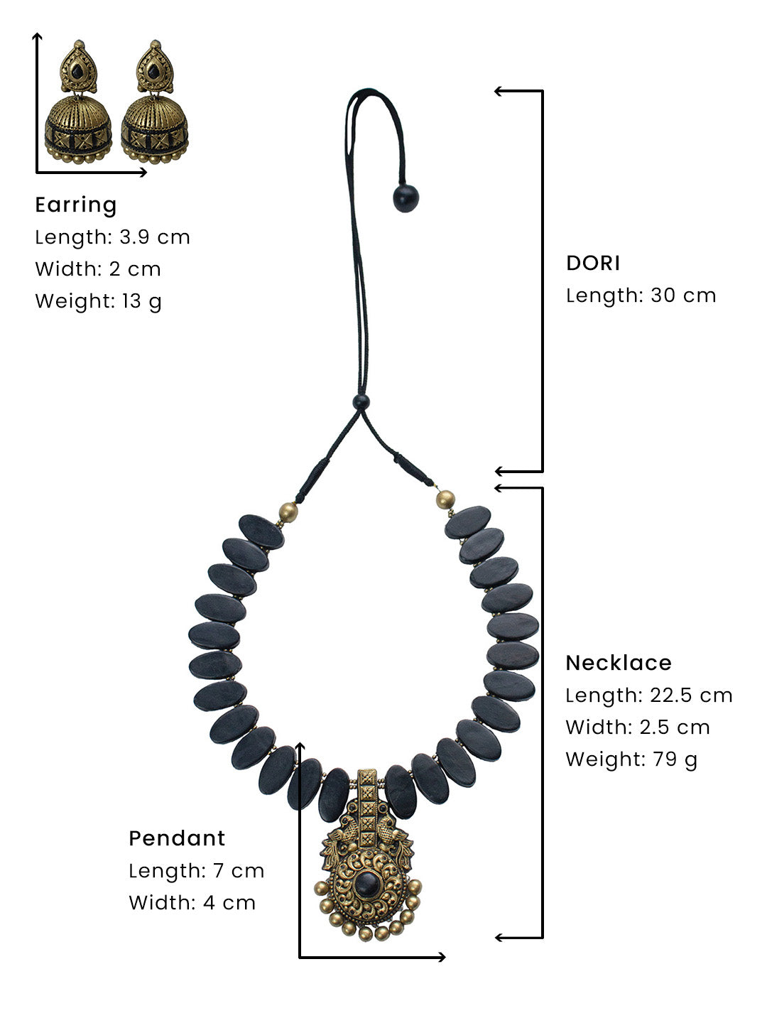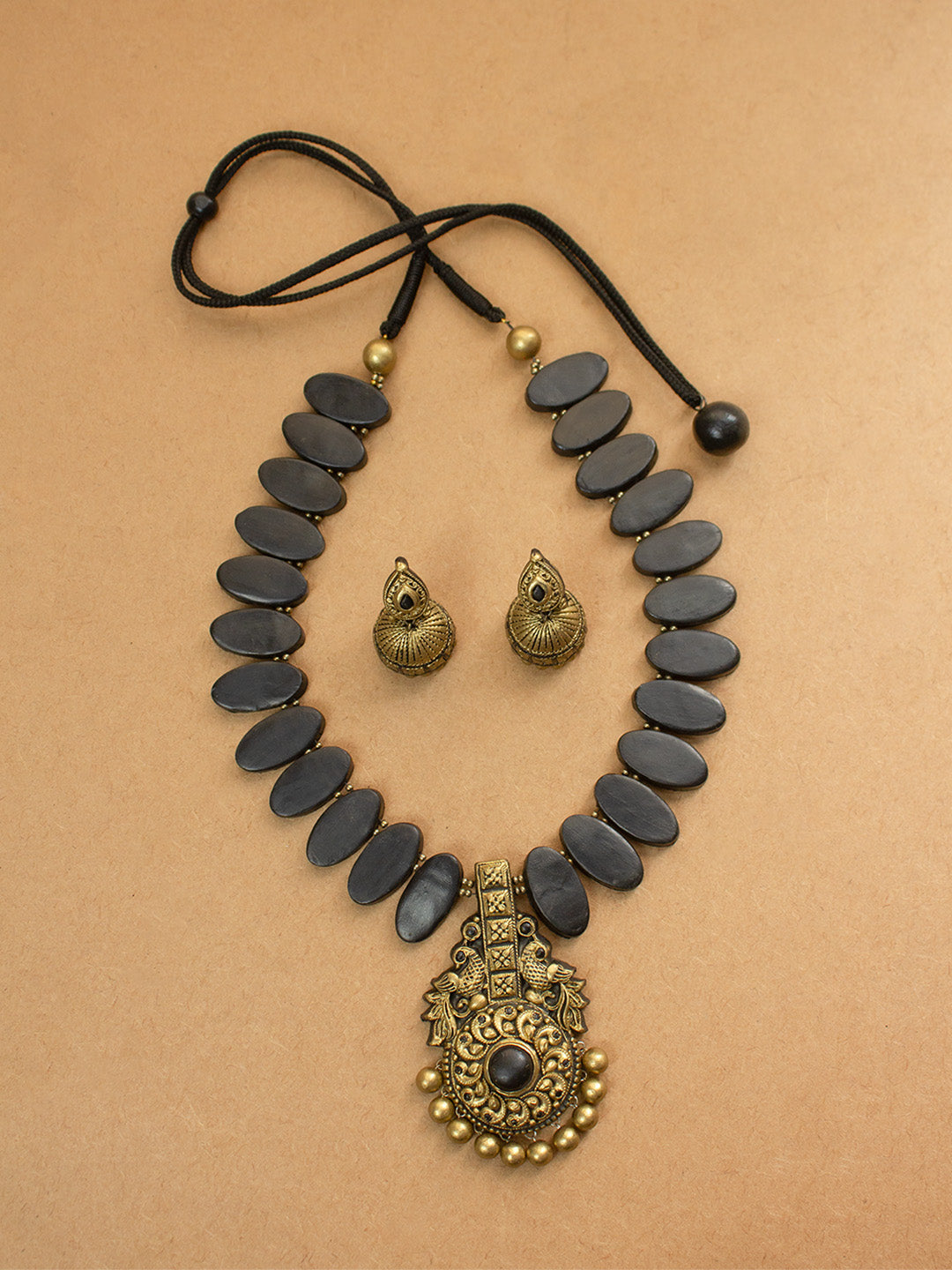 Shyamamayura — Antique Gold and Black Peacock Design Handmade Terracotta Necklace Set