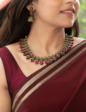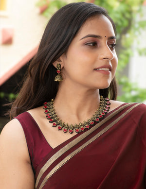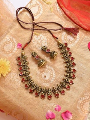 Home Antique Gold and Maroon Lakshmi Leaf Design Fringe Pattern Handmade Terracotta Necklace Set