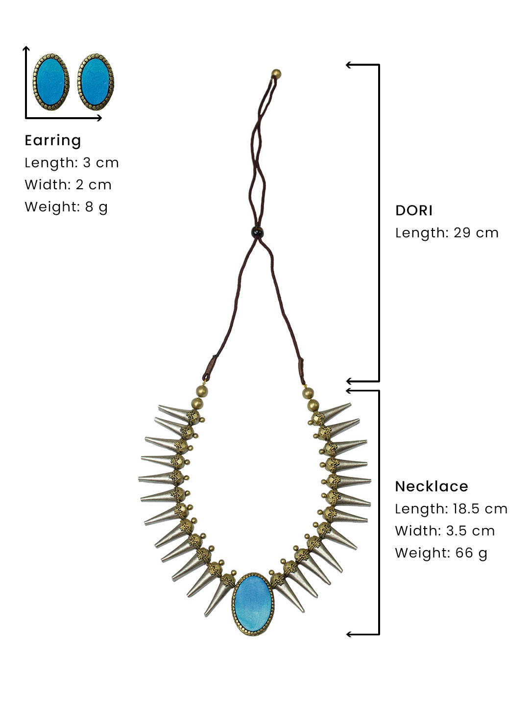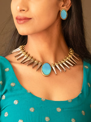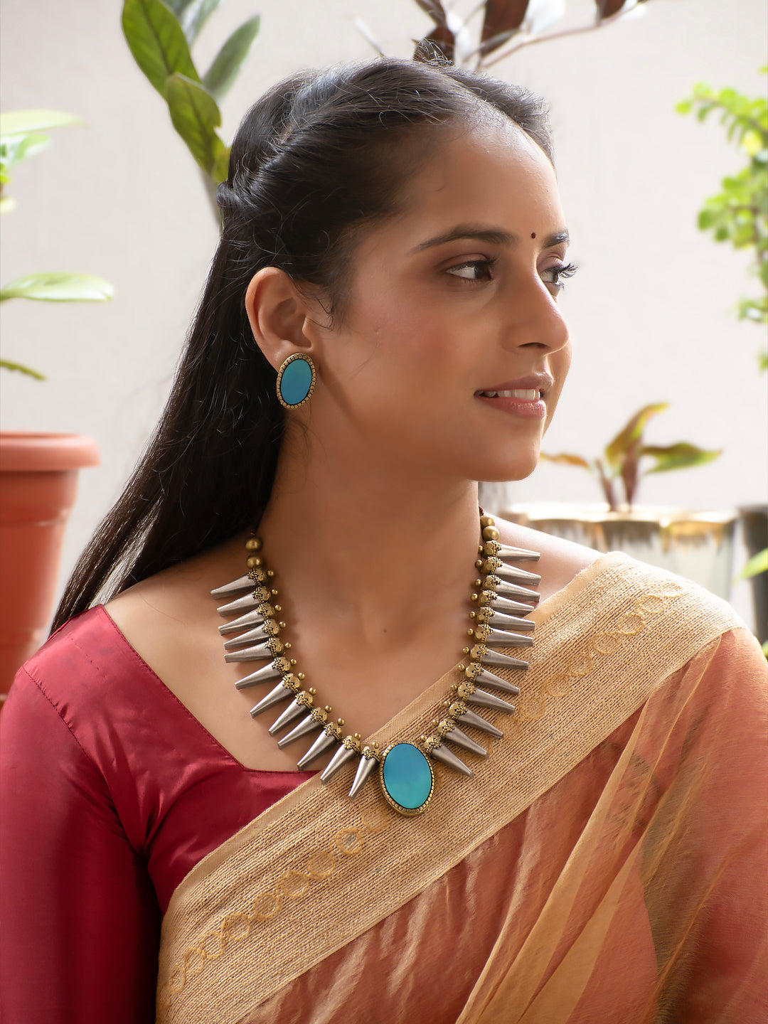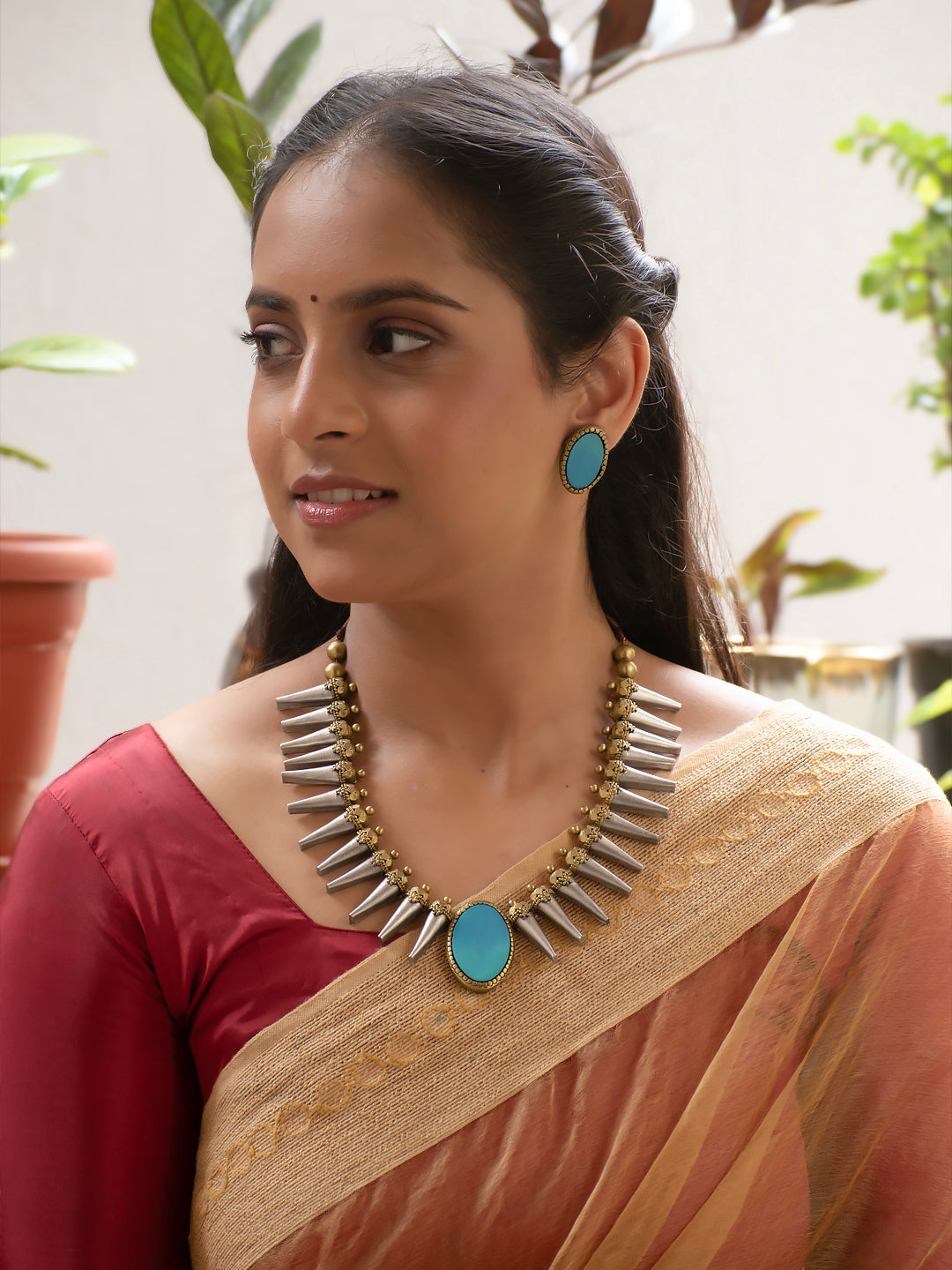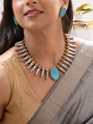 Antique Gold Antique Silver and Blue Spike Boho Tribal Design Handmade Terracotta Necklace Set