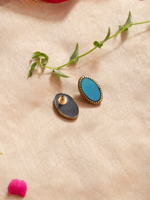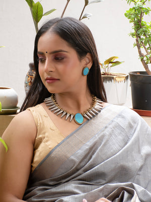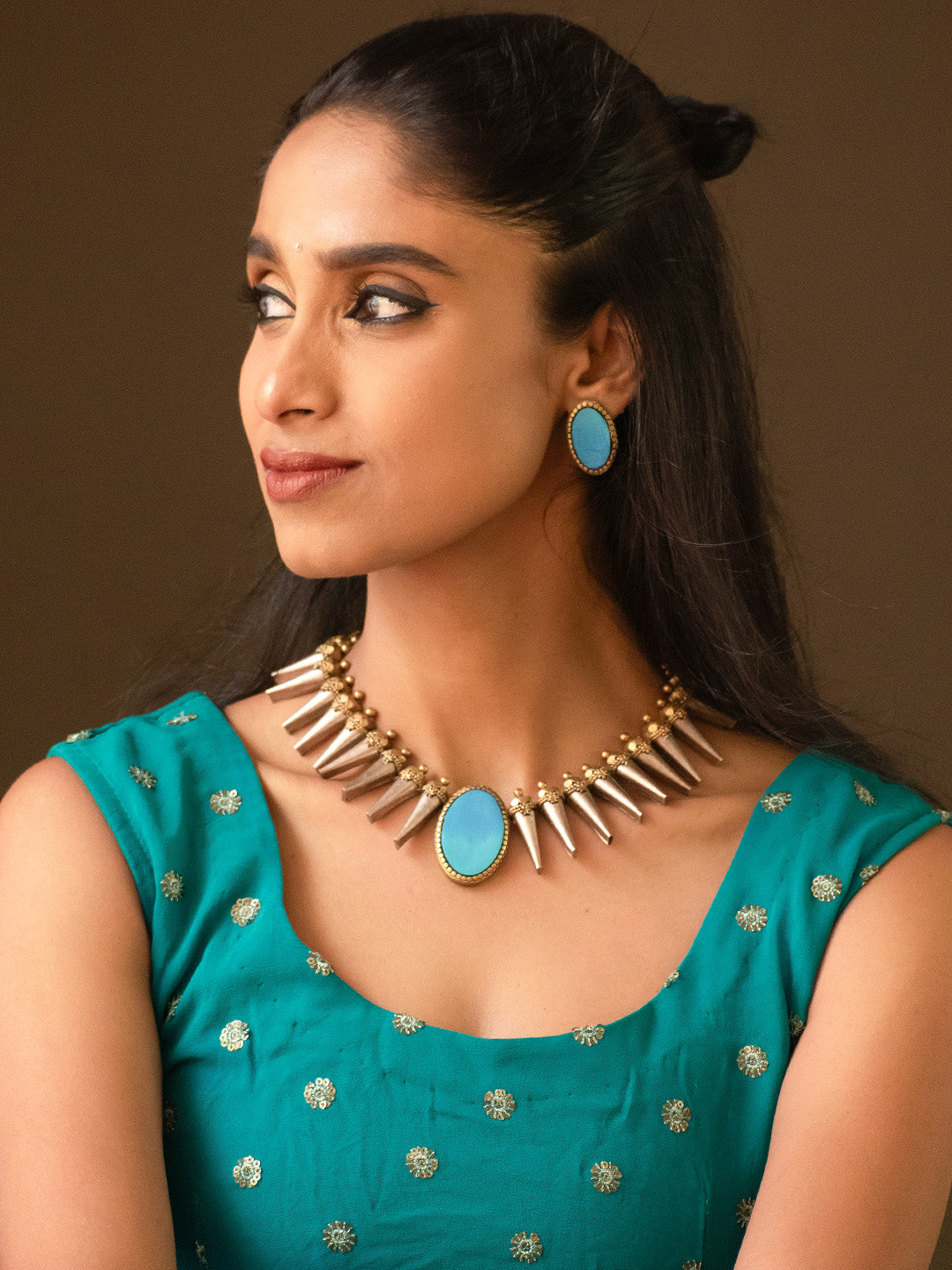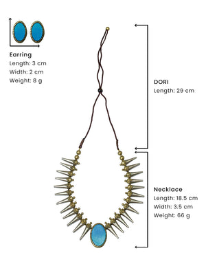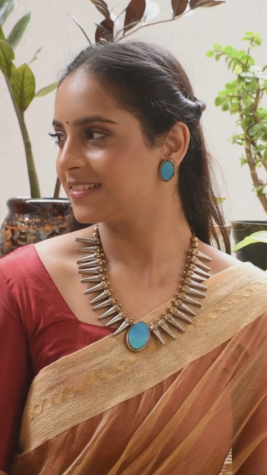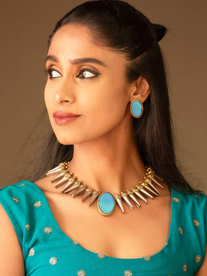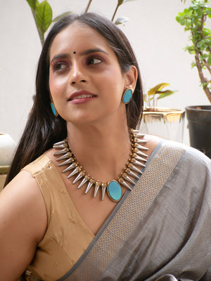 Antique Gold Antique Silver and Blue Spike Boho Tribal Design Handmade Terracotta Necklace Set