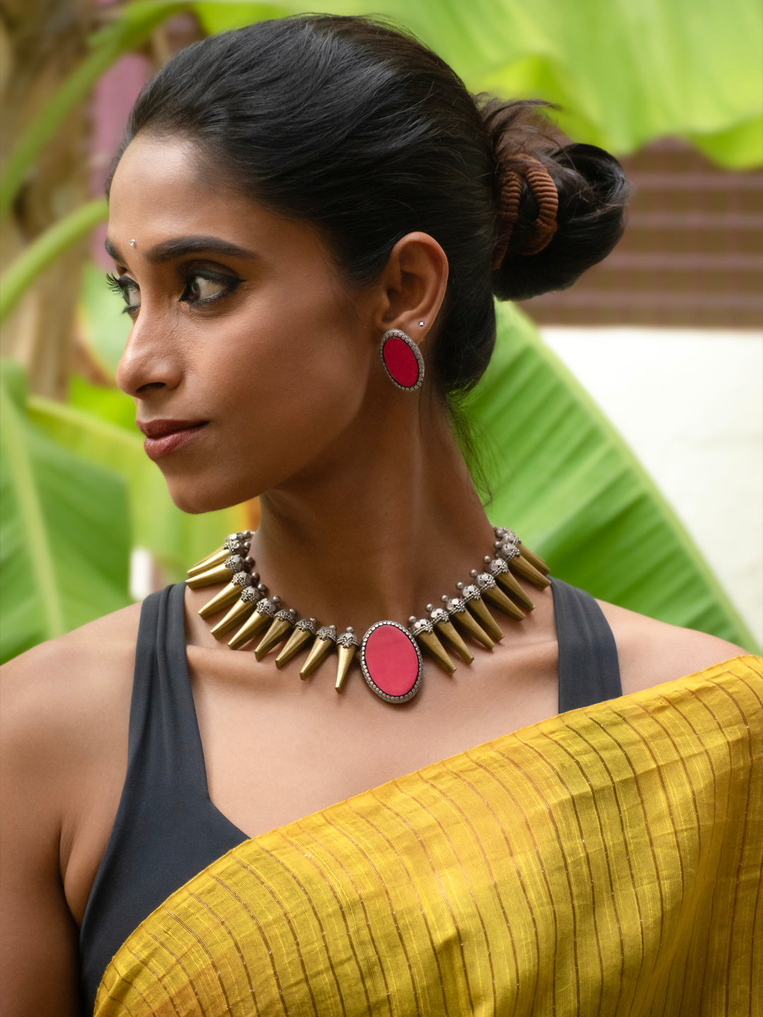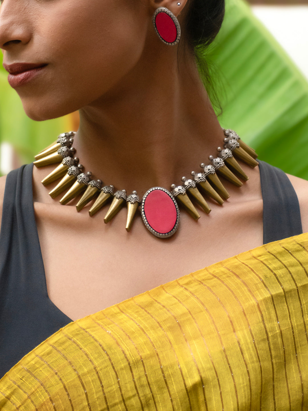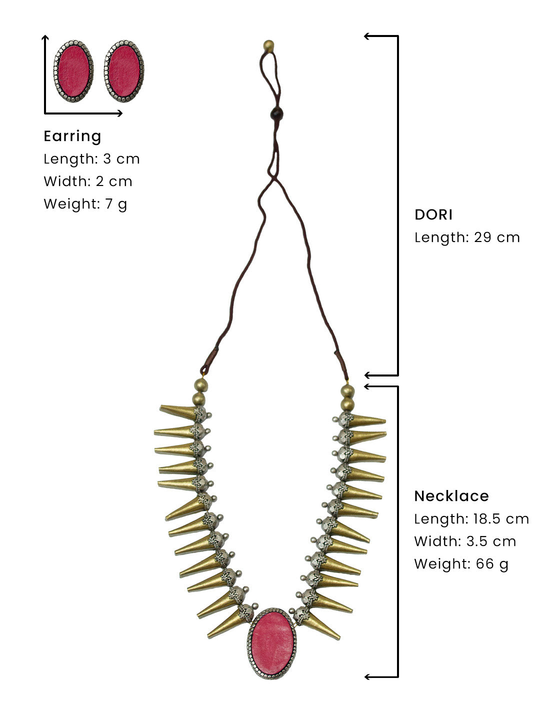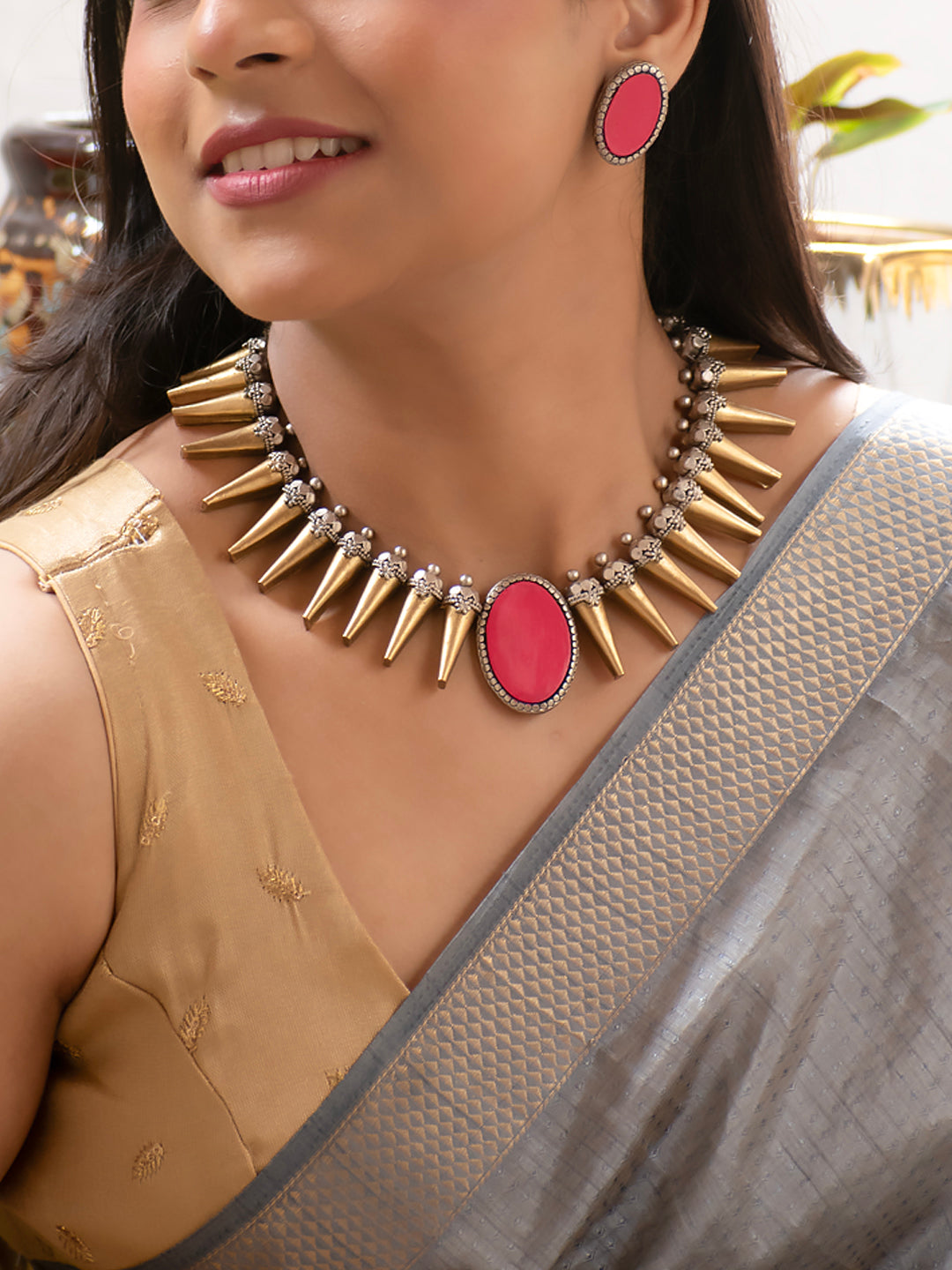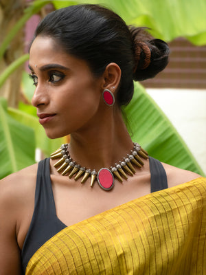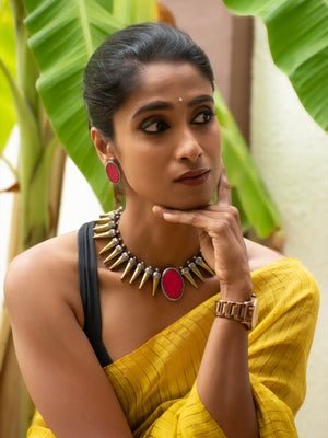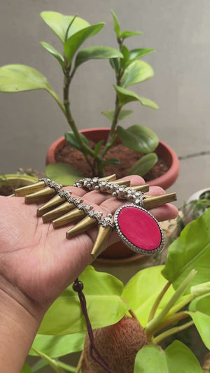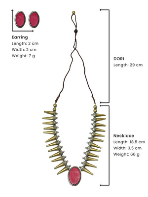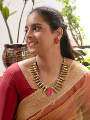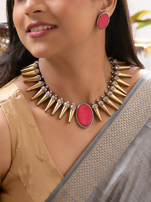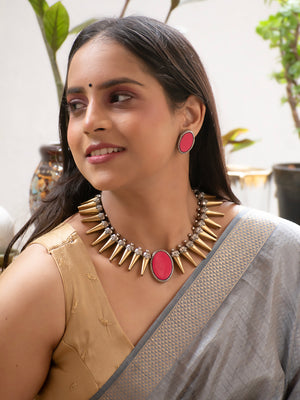 Antique Gold Antique Silver and Pink Spike Boho Tribal Design Handmade Terracotta Necklace Set