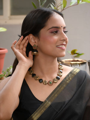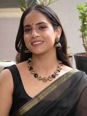 Antique Gold Black Red Green Peacock Tear Drop Shape Design Minimalistic Handmade Terracotta Necklace Set